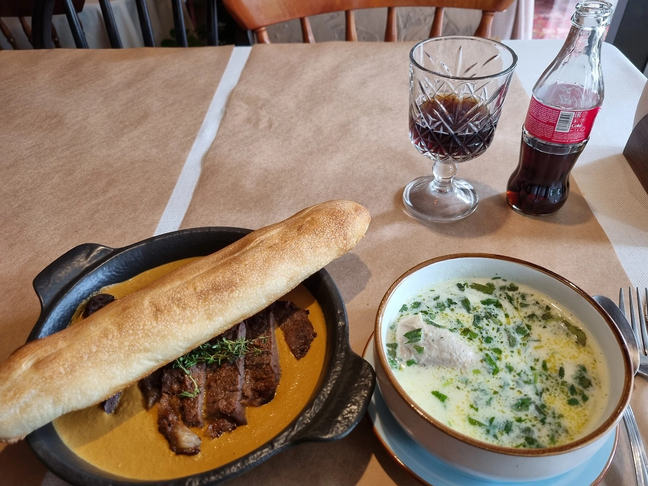 고기가 당겨서 쇠고기요리하나 와 따뜻한 수프를 시켰다. 기다란 바게트 빵 하나까지 따라 나왔다.