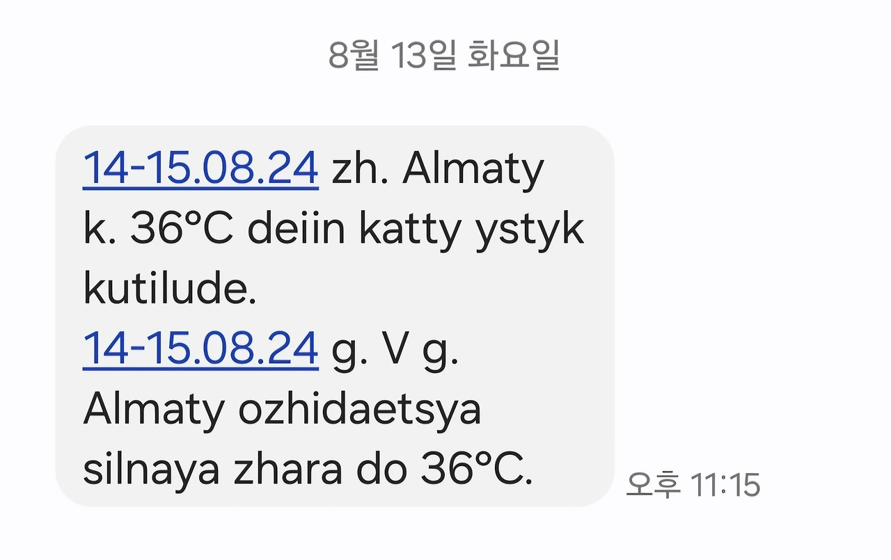 (우리나라처럼 더위에 조심하라는 안내문자가 온다)