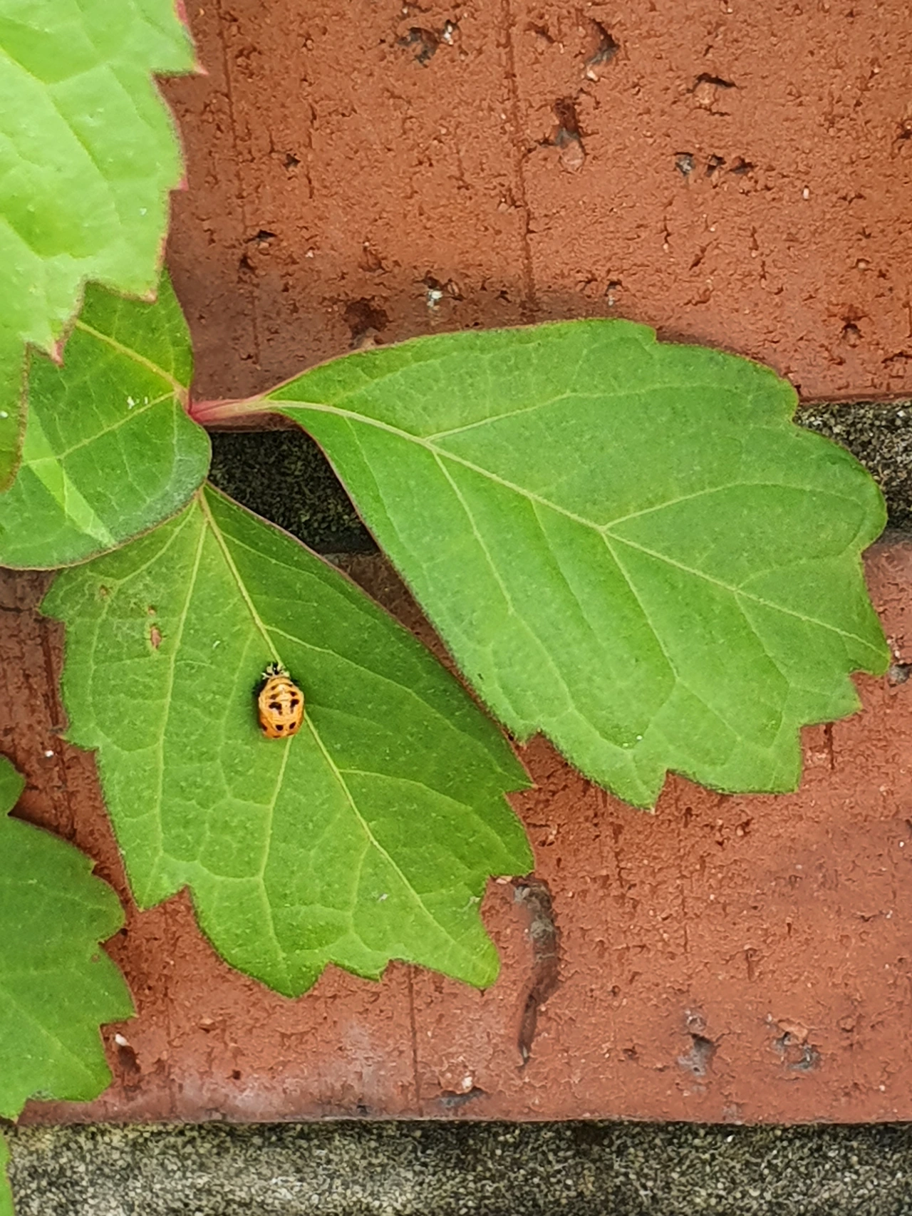 공원 산책을 마치고 모퉁이를 돌아서는데 담장 밖으로 뻗은 잎새 위에 앉은 갈색 무당벌레가 눈에 띈다.