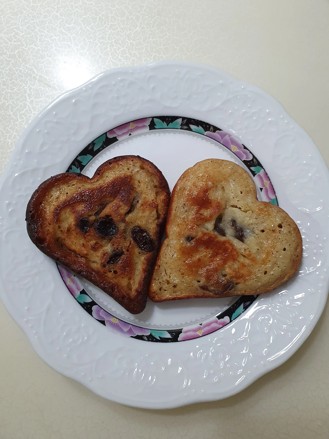 남편에게 뭔가 해주고 싶어 집에 오자마자 계란, 우유, 유자청과 건포도, 계피를 넣고 버터도 듬뿍 넣어 하트빵을 구웠다.