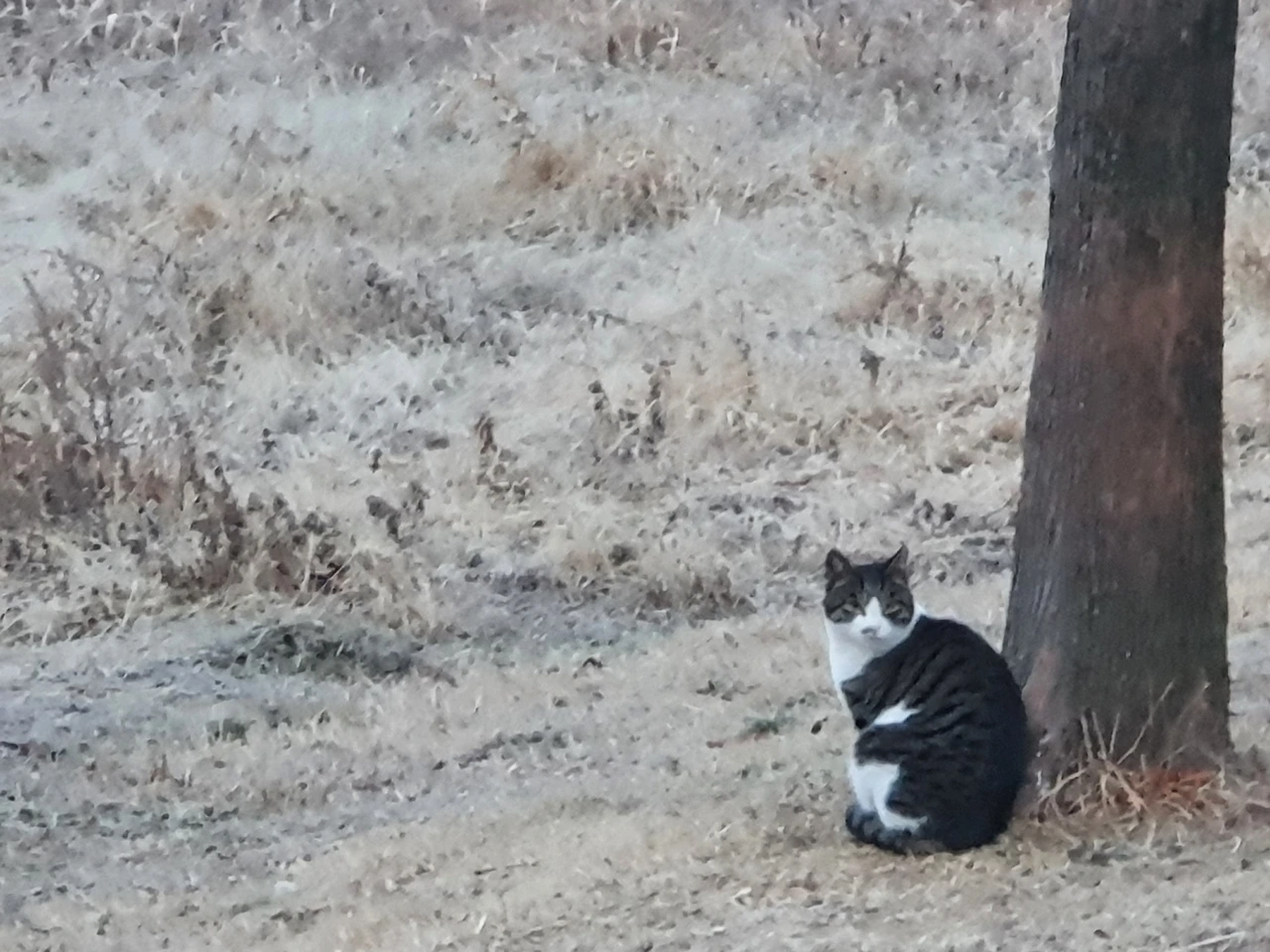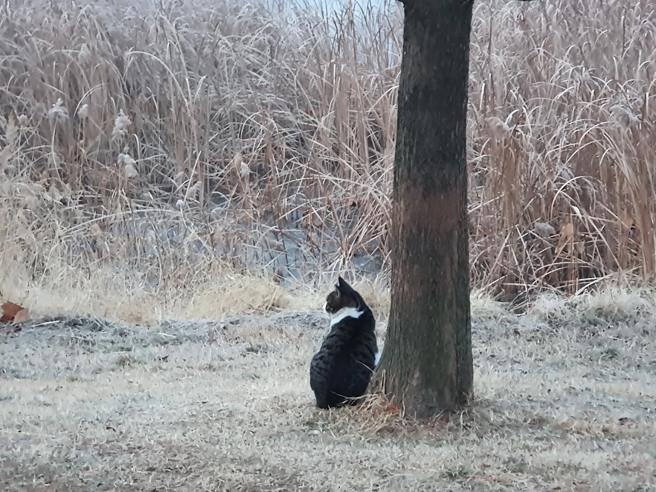 아침 산책을 나갔다가 나무 옆에 앉아 저수지를 바라보는 고양이를 만났습니다.