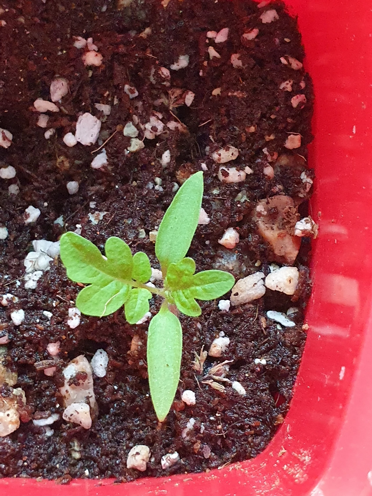 나는 어찌할 바를 모르다가 3주쯤 전에 심어 네 개의 잎이 나온 방울토마토 싹을 보여주었다.