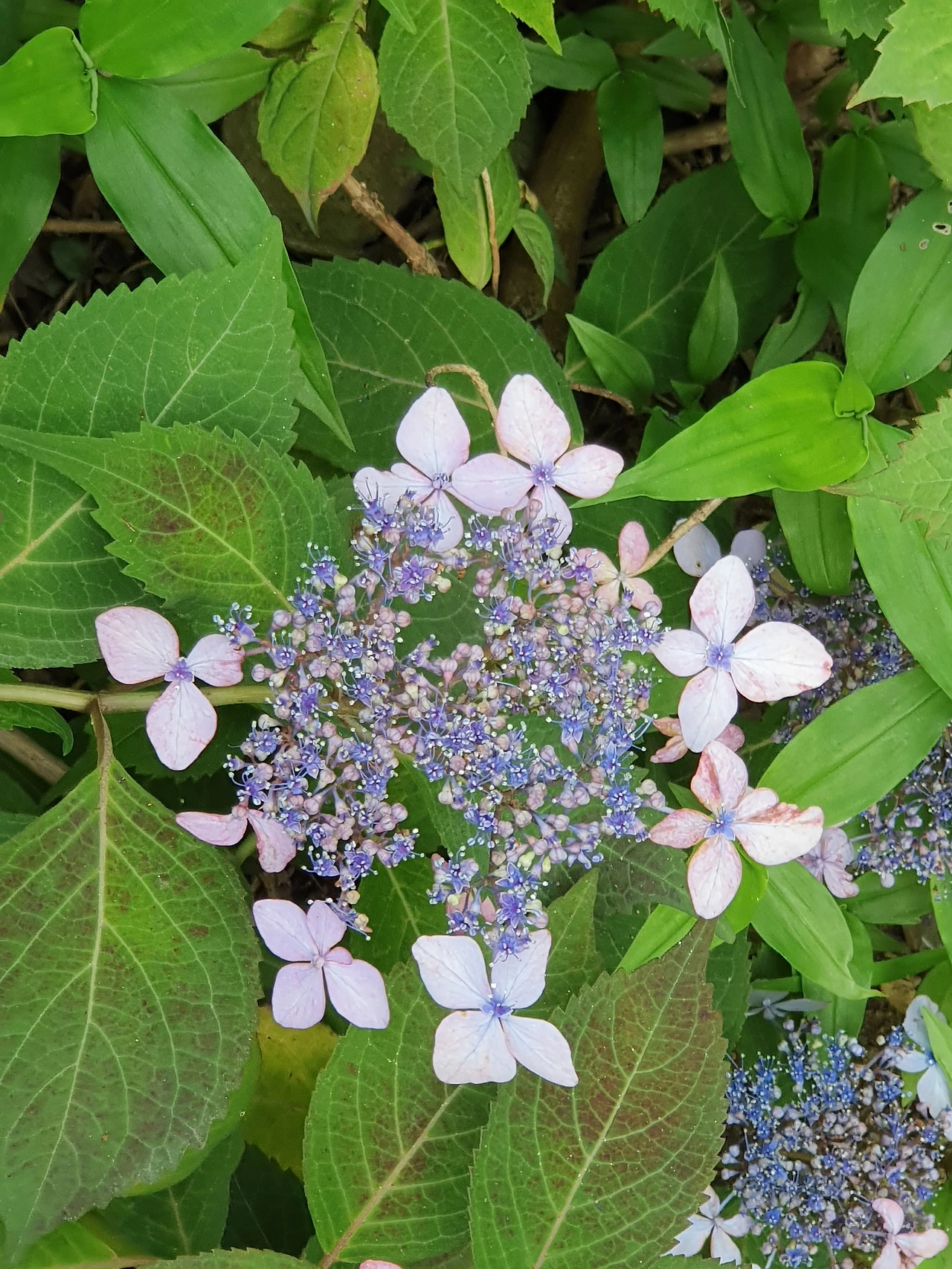 그 옆에는 수국이 보라색, 자주색, 하늘색으로 풍성하게 피어있다. 어찌 보면 꽃술이 있는 중심부가 족두리이고 가장자리로 뻗은 꽃잎은 가장자리로 뻗어 나와 흔들리는 족두리 장식 같다.