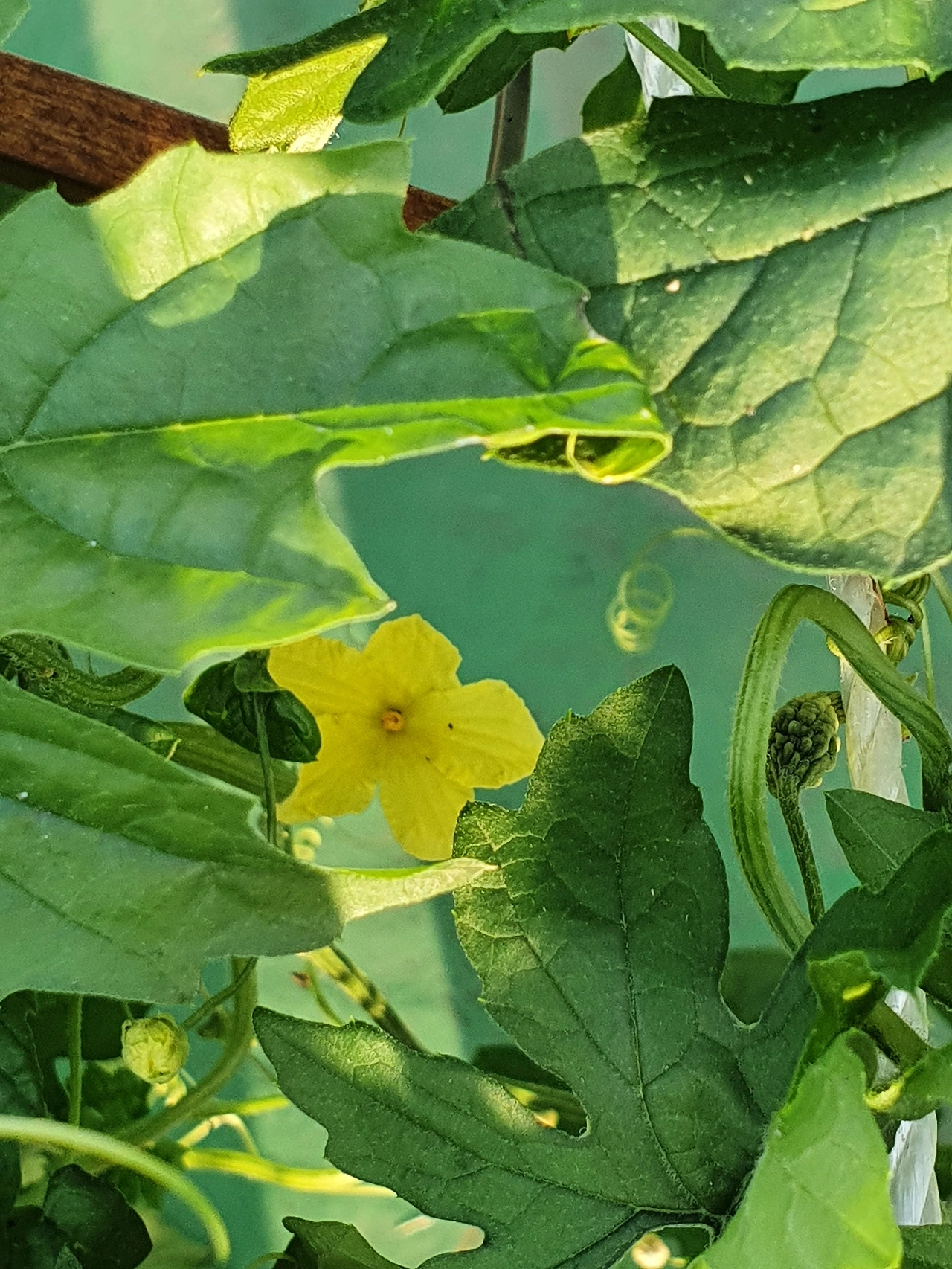 음식물쓰레기로 만든 거름을 먹고 어머니가 엮어놓은 줄을 따라 수세미 잎이 초록 향기를 풍기며 펼쳐져 있었다.