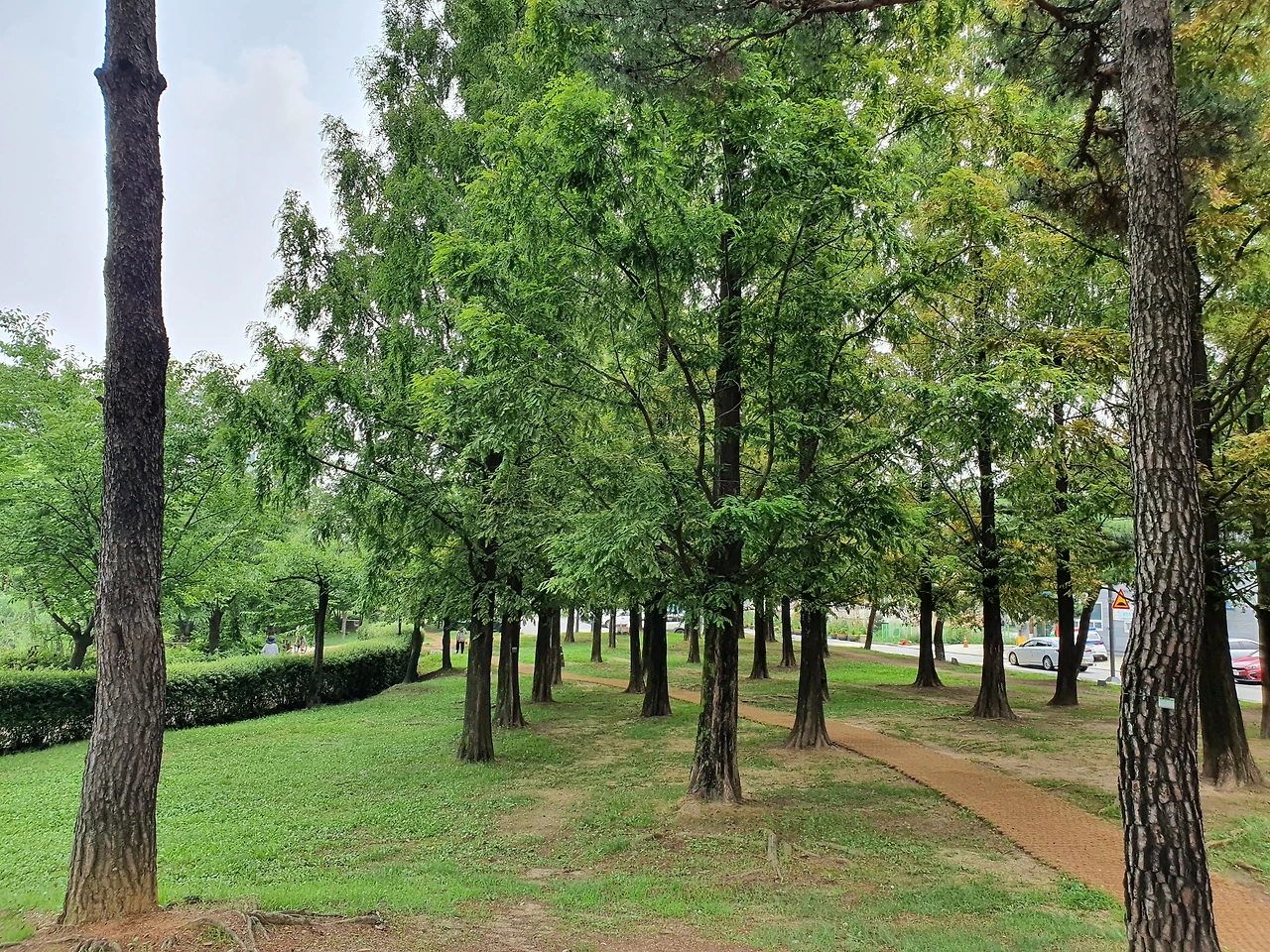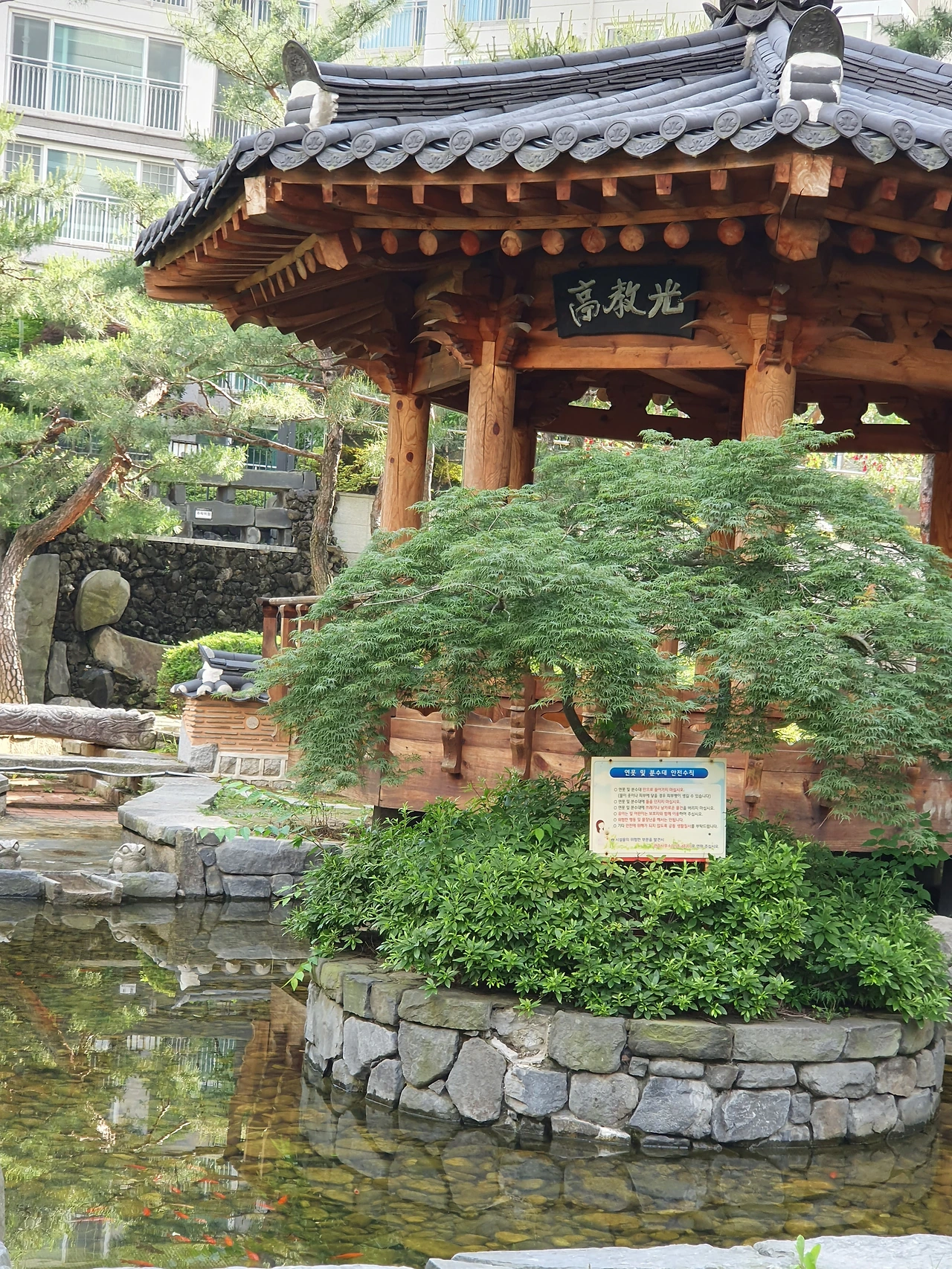 아파트 단지 안에 예쁜 정자와 연못, 한옥 담장이 생겼다. 갈색 담장 앞에는 데이지 꽃이 하얗게 피어있다. 가운데 노란 꽃술을 품은 데이지 꽃은 태양의 사랑을 흠뻑 받고 감사의 미소를 짓는 듯하다.