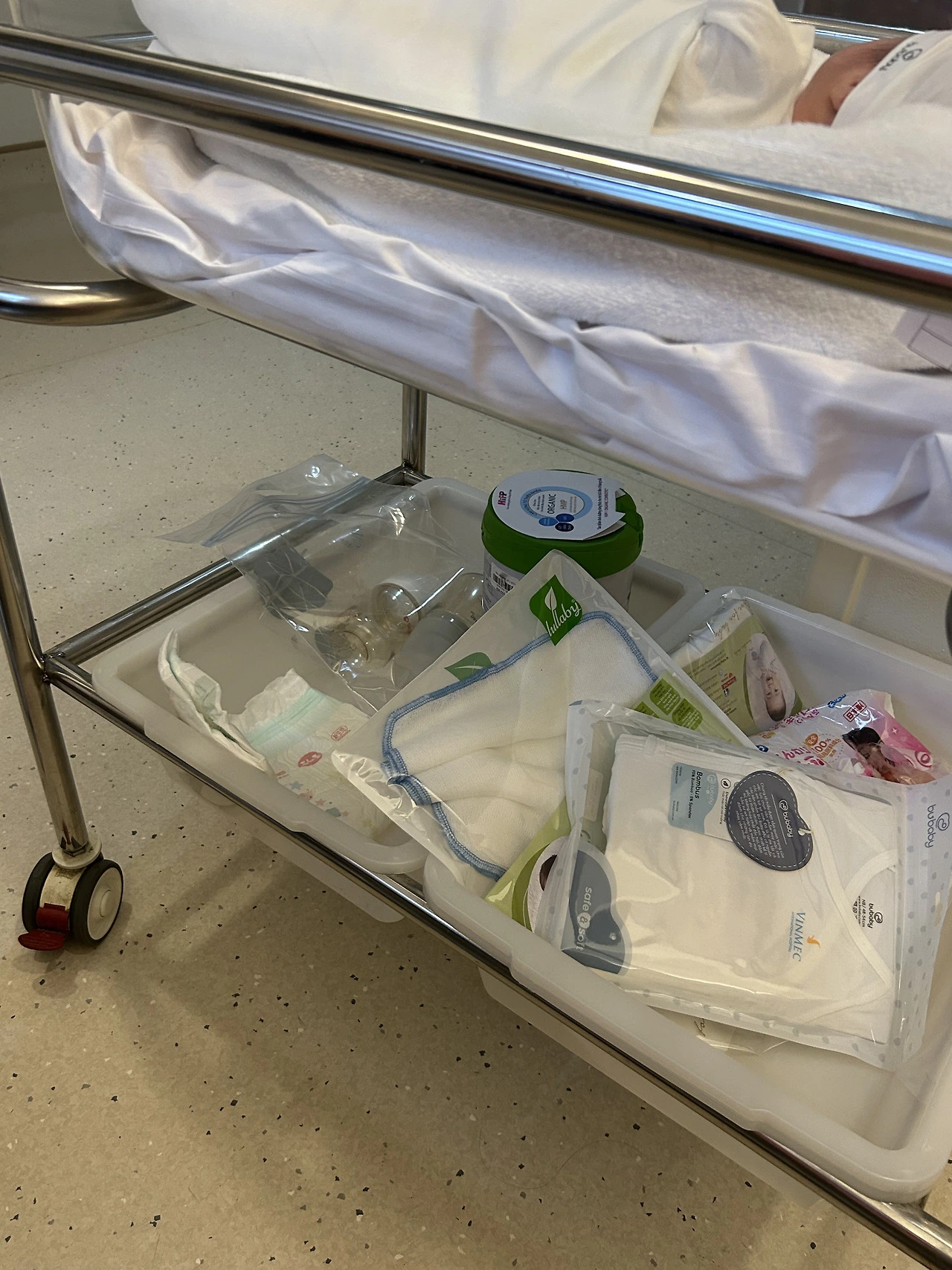 병원에서는 아기 옷, 아기 손수건, 아기 물티슈, 기저귀, 손+발싸개, 모자, 속싸개, 산모용 일회용 팬티, 대형 생리대 등등 아주 넉넉하게 다 선물로 주기 때문에 출산가방을 따로 챙겨 올 필요가 하나도 없다! 수건이나 일회용 칫솔 등도 매일 가져다준다. 아! 유일하게 준비해야 할 건 아기 젖병이다! 병원에서 분유도(NAN분유) 제공해 주는데 나는 따로 챙겨갔다.