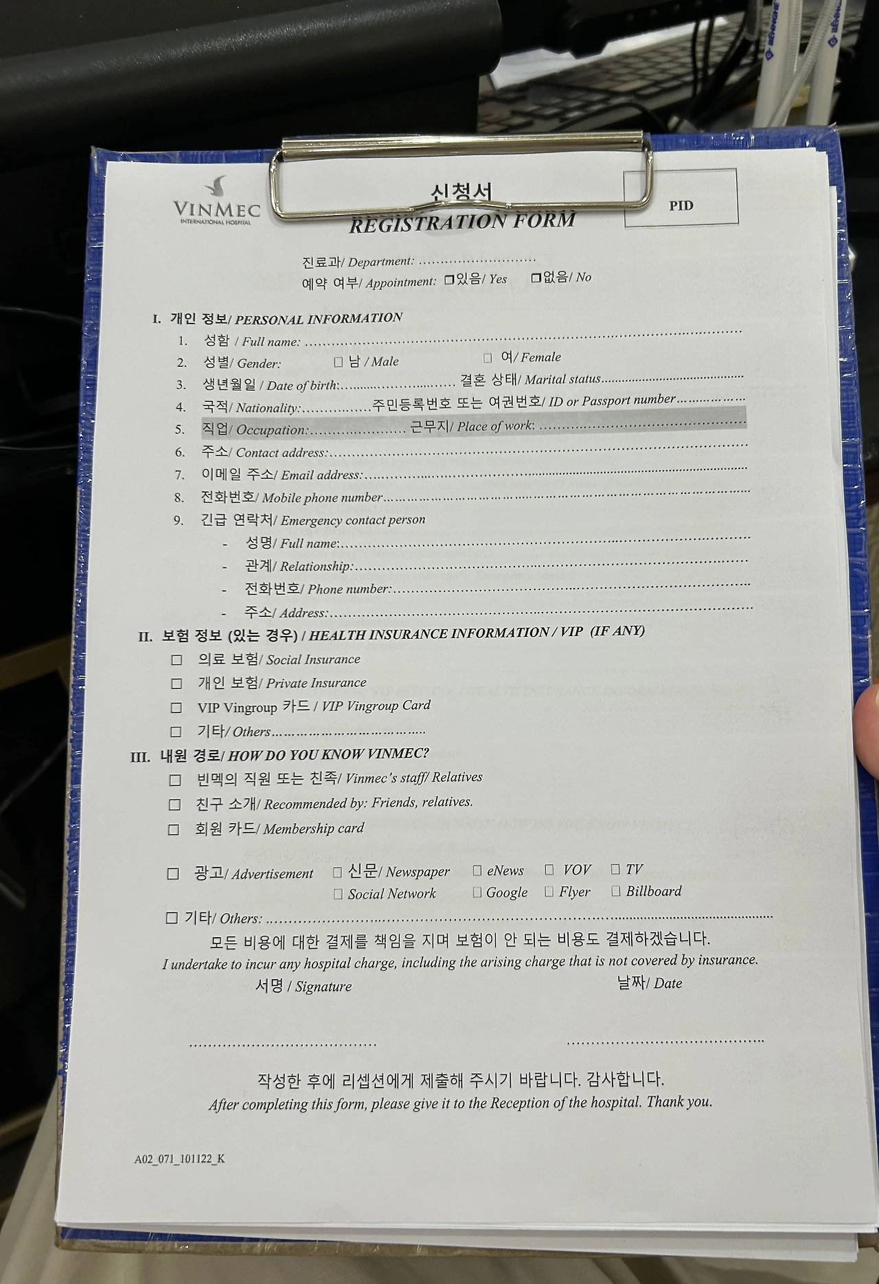 번호표가 따로 없기 때문에 눈치껏 접수대에 가서 접수를 하면 되는데 첫 방문 시 작성하는 문서는 한국어 버전으로 알아서 주셨다. 또 빈맥에는 한국어 통역팀이 있어서 도움을 받을 수 있다. (접수할 때 직원분이 알아서 한국인 와있다고 통역팀에게 전화를 해준다. 몸무게와 혈압을 재고 소변검사까지 마치고 진료실 앞에서 기다리면 통역해 주는 분이 오신다.)