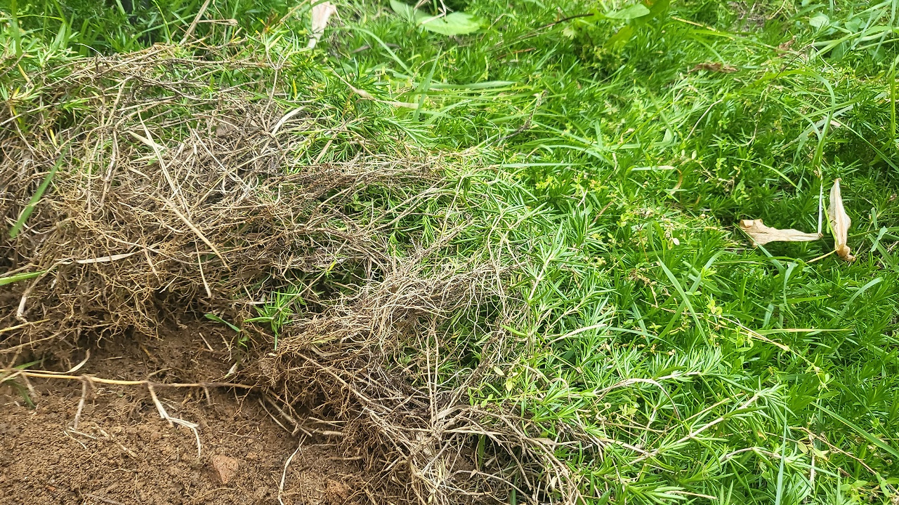 "이 뿌리 보이니? 굵은 것이 잔디 뿌리야. 얘네들을 따라가면서 제거하고, 절대 끊어지면 안 돼! 그래야 온전히 제거할 수 있어. 보이는 잎만 뽑았다가는 금세 다시 올라온단 말이야. 뿌리를 아예 뽑아 다시 나지 않게 해야지!"