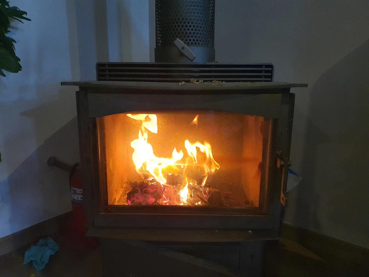 나의 불쏘시개는 계란판이다. 압축된 종이라 훨씬 오래 제 역할을 잘한다. 이렇게 나무를 크기별로 쌓고 사이사이에 계란판을 찢어 놓는다. 나무 사이에 공기와 바람이 잘 통하도록 공간을 확보하는 것도 잊으면 안 된다. 재받이도 열고, 연통과 연결된 바람구멍도 열어준다.