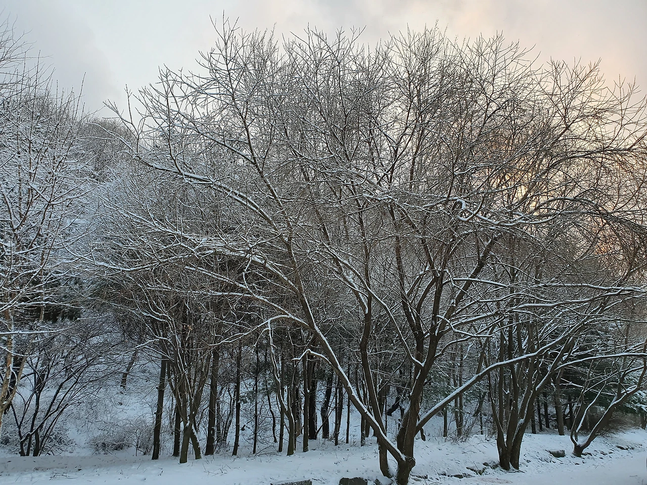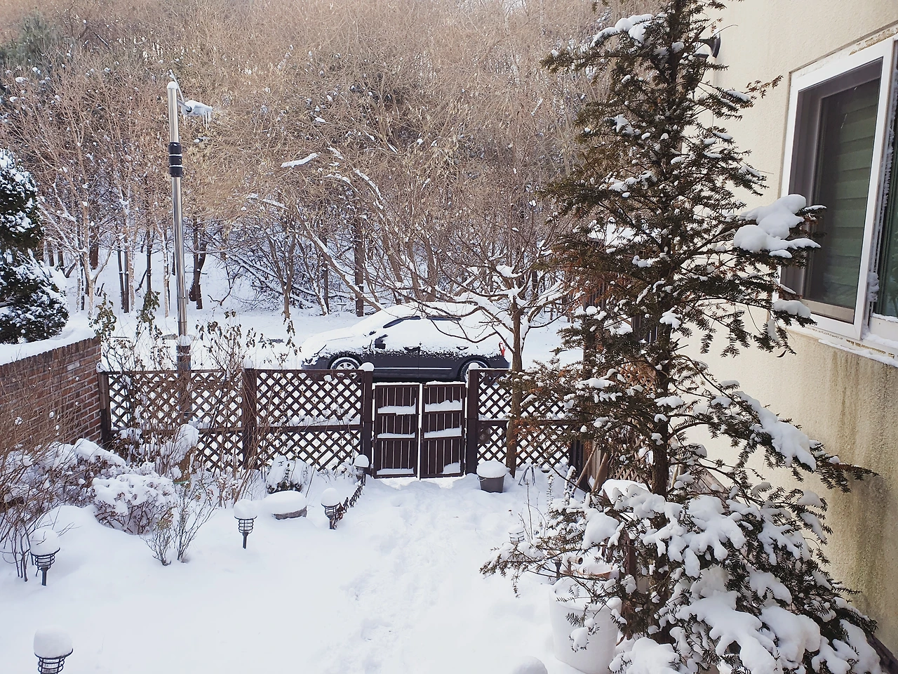 서울과 달리 집앞 산과 정원, 도처에 있는 마른 나뭇가지, 그리고 나지막한 옆집 담벼락과 지붕에까지 내려앉은 눈은 세상을 압도했다.