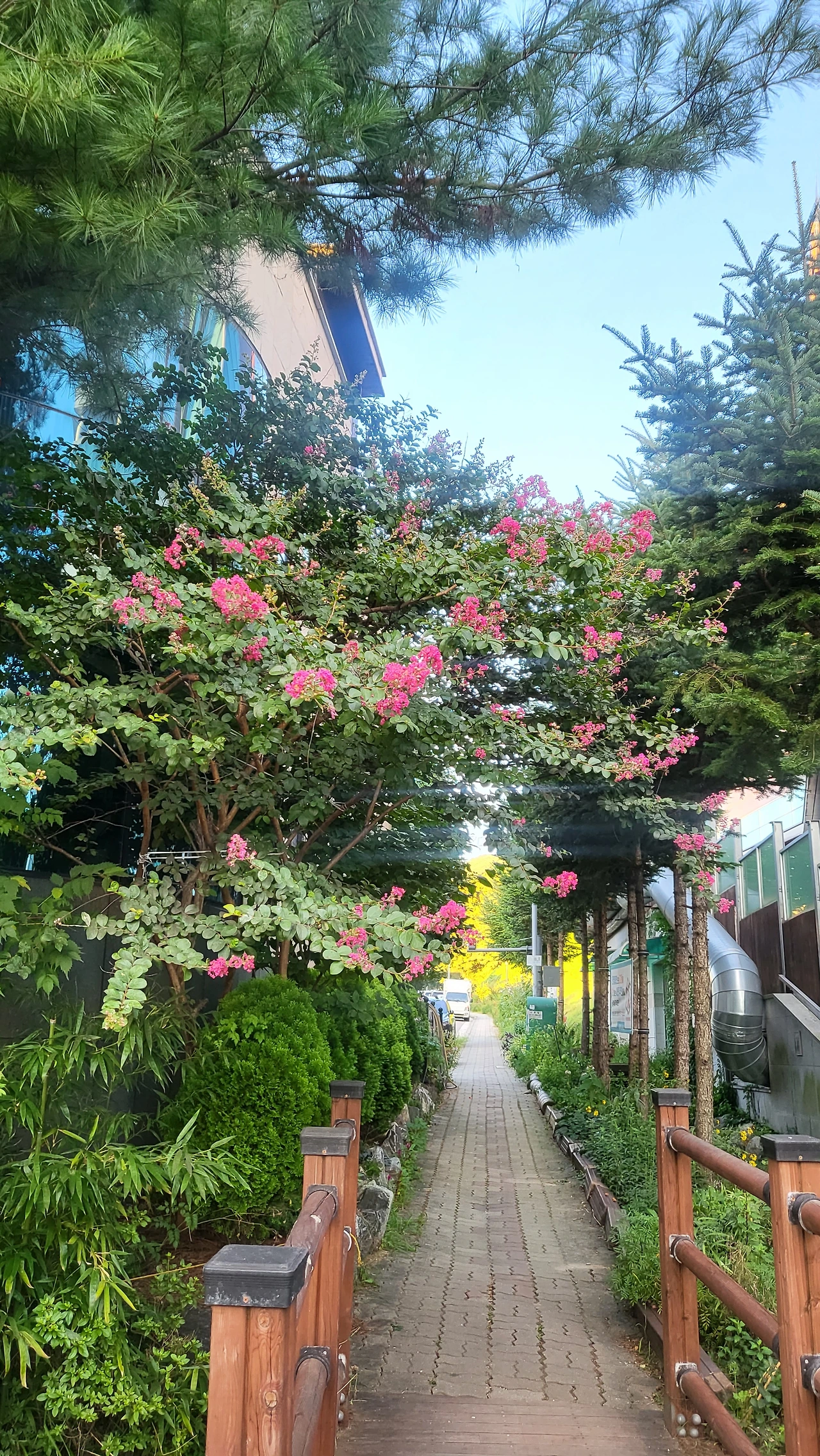 마지막 나무는 내가 가장 아끼는 배롱나무이다. 목백일홍이라고도불리우는 이 나무는 주택단지의 가장 인기 수종이다. 초여름부터 집집마다 붉은 백일홍이 꽃을 피우며 골목에 여름을 알린다.