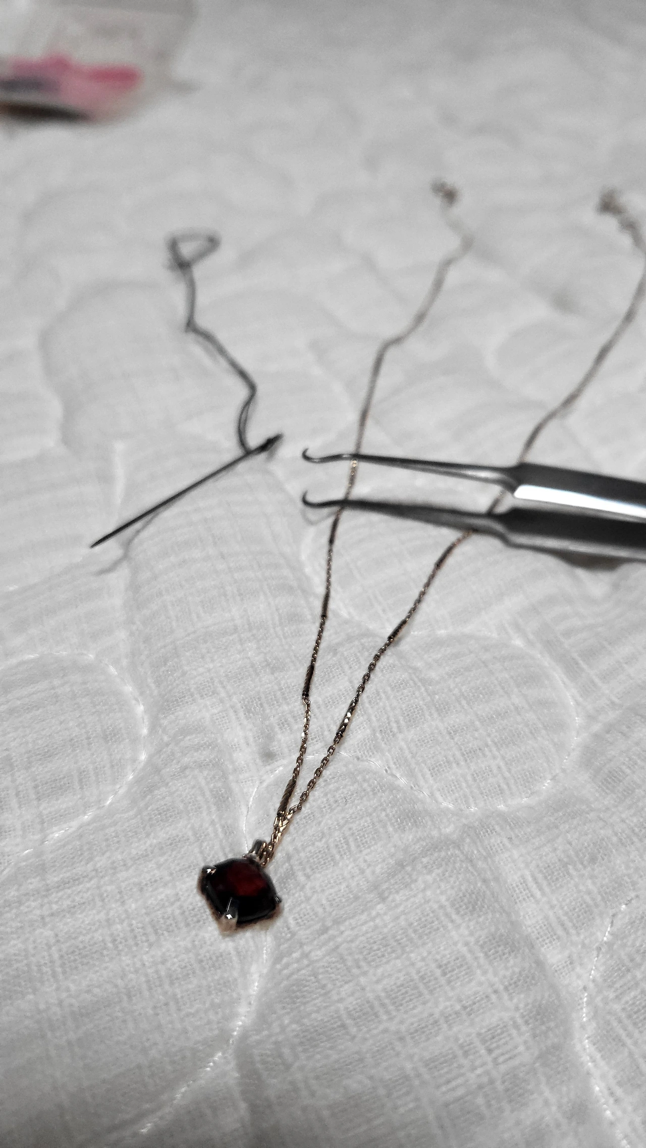 아들과의 대화를 급히 마무리하고 안방으로 돌아와 가는 핀셋까지 동원하며 매듭을 풀기 위한 필사적 노력을 시작했다. 하지만 가는 줄 특성상 어느 줄이 어느 줄 위에 있는지가 전혀 읽히지 않았다. 그리고 이리 돌리고 저리 돌려보니 매듭은 풀리기는커녕 더 단단해지는 듯했다.