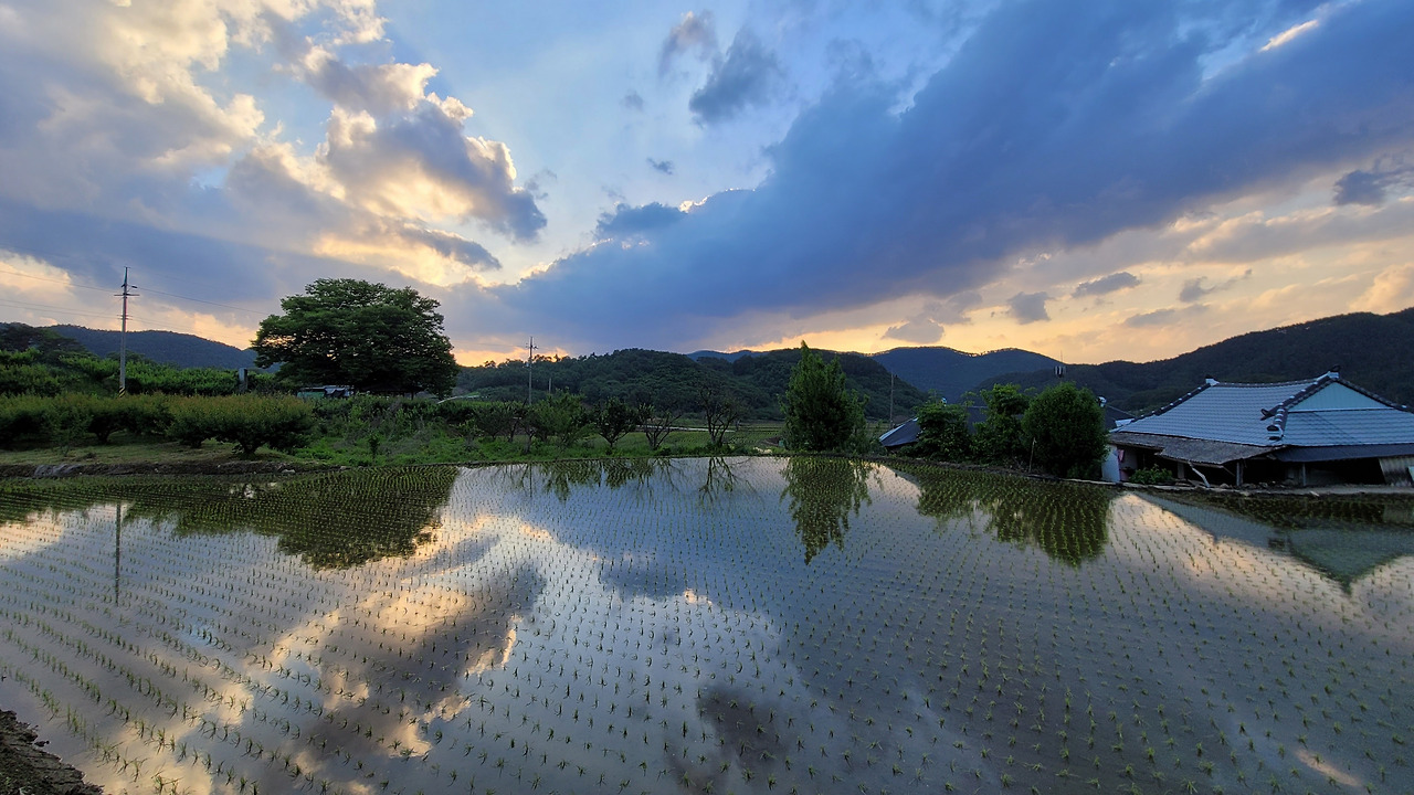 사진설명 - 얼마 전 모내기를 마친 논과 마을 앞 300년이 넘은 정자나무 배경이다. 들판에서 일을 할 때면 새참을 나눠먹고, 여름이면 동네 어르신들께 시원한 낮잠을 잘 수 있게 해주는 유일한 곳이기도 하다.