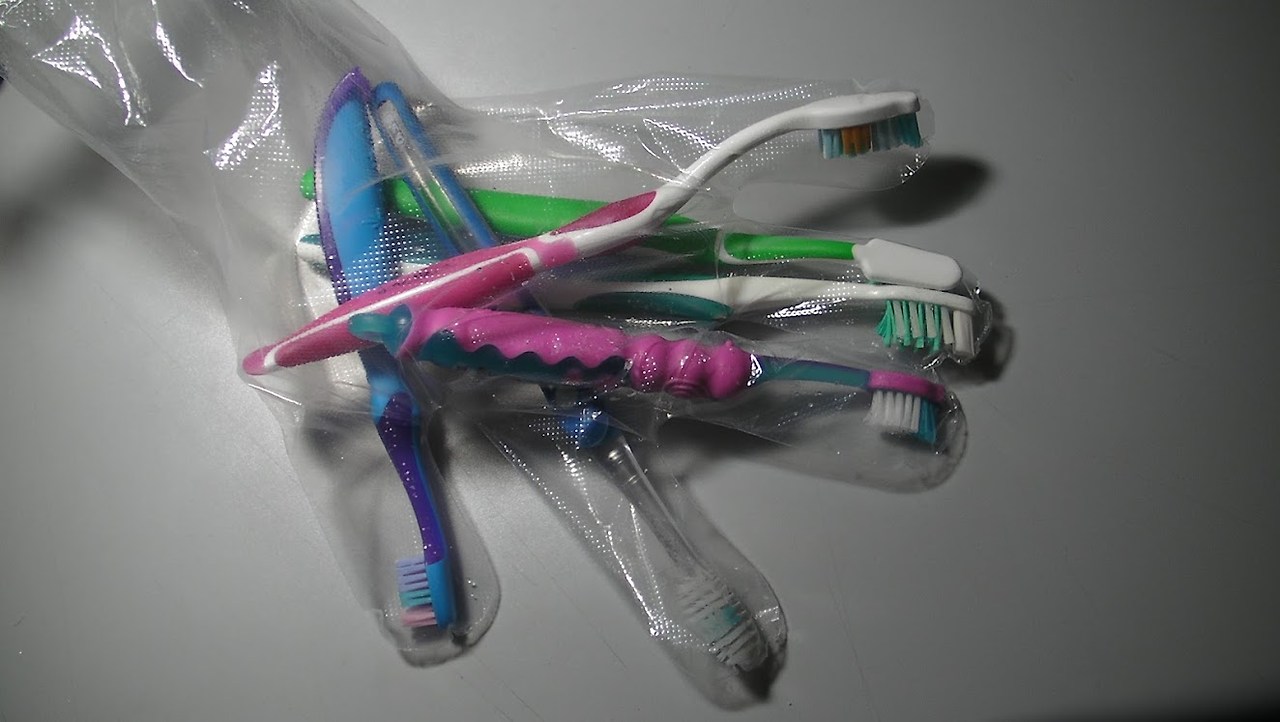 “각자 양치하고 물기 잘 털어서 비닐장갑에 칫솔 넣어”.