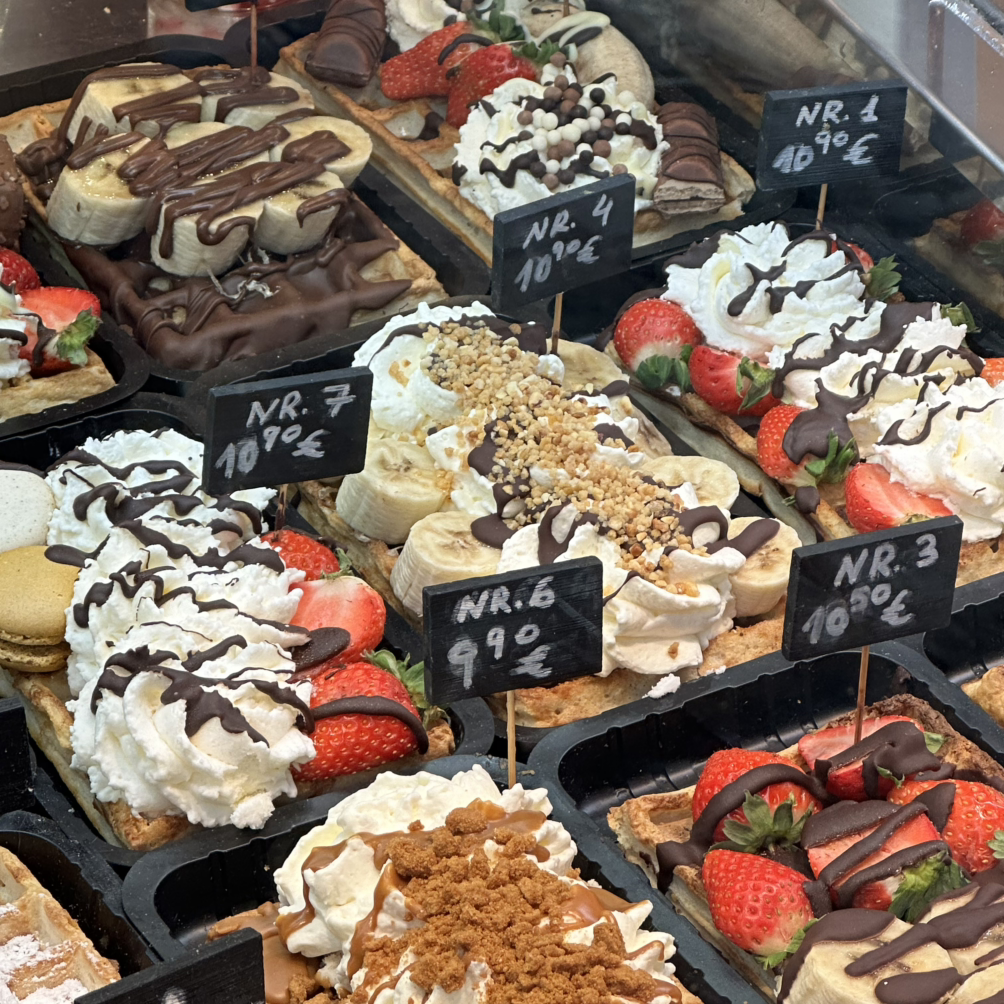 리에주 와플은 반죽 안에 펄 슈가가 들어있어 씹히는 맛이 있고 조금 더 빵보단 과자 같은 느낌이다. 반죽 자체가 브뤼셀 와플보단 무게감이 있고 좀 더 달다. 와플 가게에 가면 브뤼셀 와플을 먹을 건지 리에주 와플을 먹을 건지 선택할 수 있고 원하는 토핑을 고르면 된다. 브뤼셀 와플은 내게 특별하진 않았지만 리에주 와플은 면세점에서 기념품으로 사가고 싶을 정도로 맛있었다. 중간중간 펄 슈가가 씹히는 게 독특했고 재밌었달까.