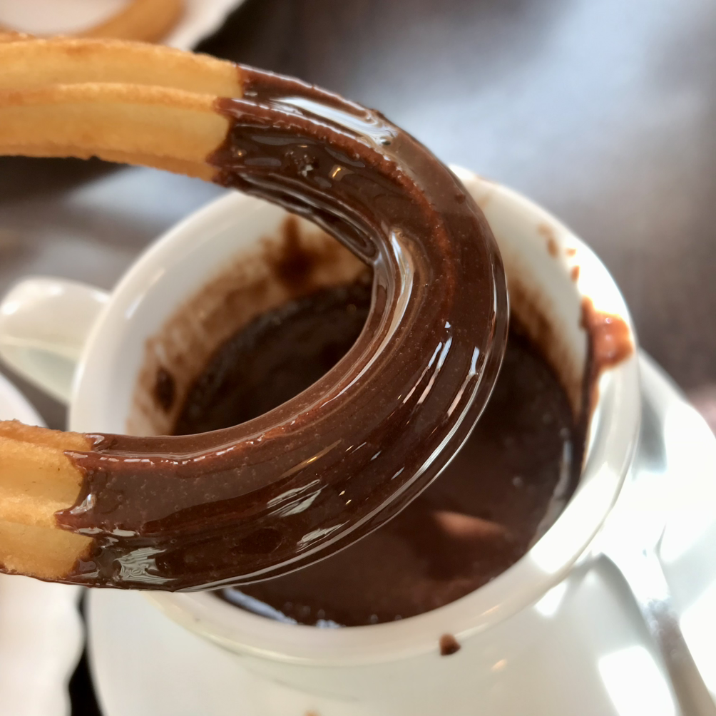 츄로스를 사면 계피 설탕 따윈 없다. 그냥 맨 빵이다. 얇고 바삭하고 약간 짭짤한 편. 보통 찍어 먹을 수 있게 꾸덕꾸덕한 핫초코를 같이 시킬 수 있다.