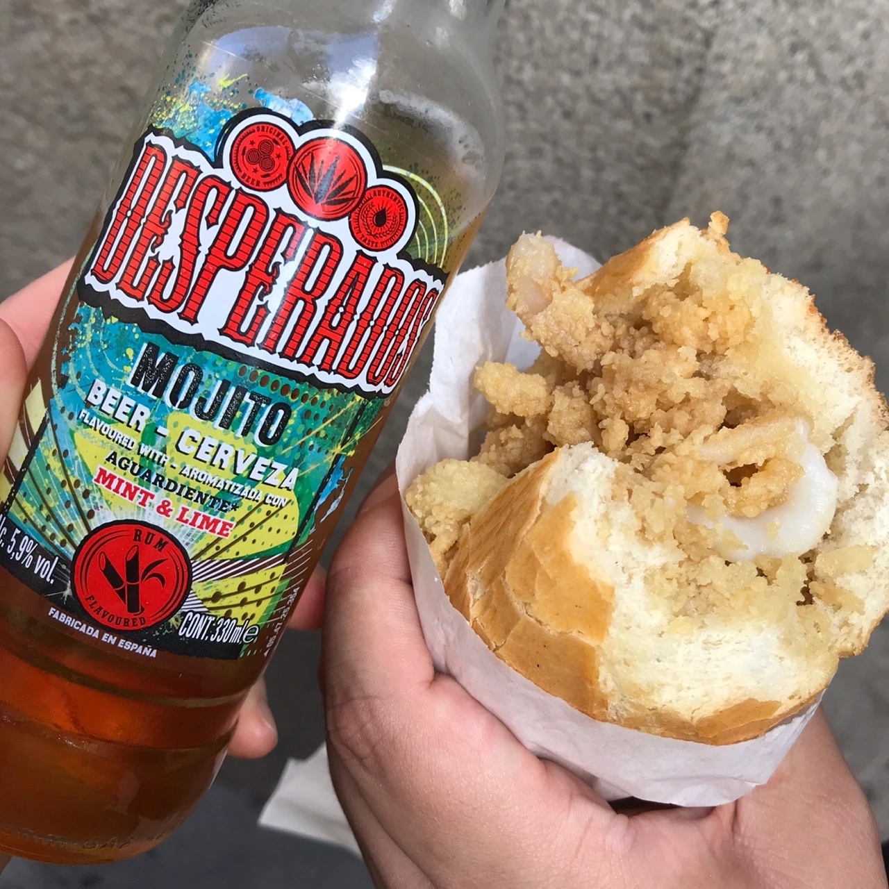 보카디요 깔라마레스라는 오징어튀김 샌드위치가 있다. 빵 안에 오징어튀김을 넣어 먹는 건데 야채도 없고 소스도 없다. 퍽퍽하긴 하지만 씹을수록 고소한 맛이 올라와 매력 있는 녀석이다. 데스페라도스 모히또 맛과 페어링 해서 먹으면 쏘 굿! 오리지널에 비해 모히또 맛은 덜 달고 쌉쌀한 민트의 맛이 아주 좋았다.