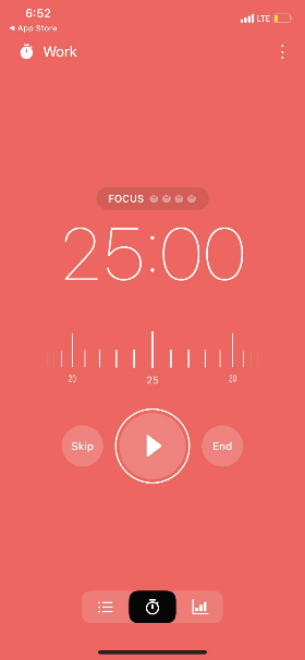 일단 핸드폰에 포모도로 어플을 깔았다. 그리고 '25분 동안 일하기 - 5분 동안 휴식하기'를 4번 반복했다. 총 2시간 동안.