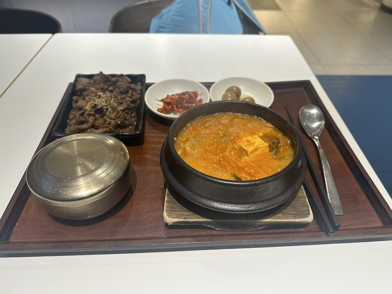 최대한 호율적으로 먹기 위해 공기밥 뚜껑에 국물과 건더기들을 최대한 덜어서 식혀두고, 불고기부터 빠르게 먹었다. 그 결과 성공적으로 김치찌개를 클리어하고, 버스 출발 사분 전에 쟁반을 반납했다.