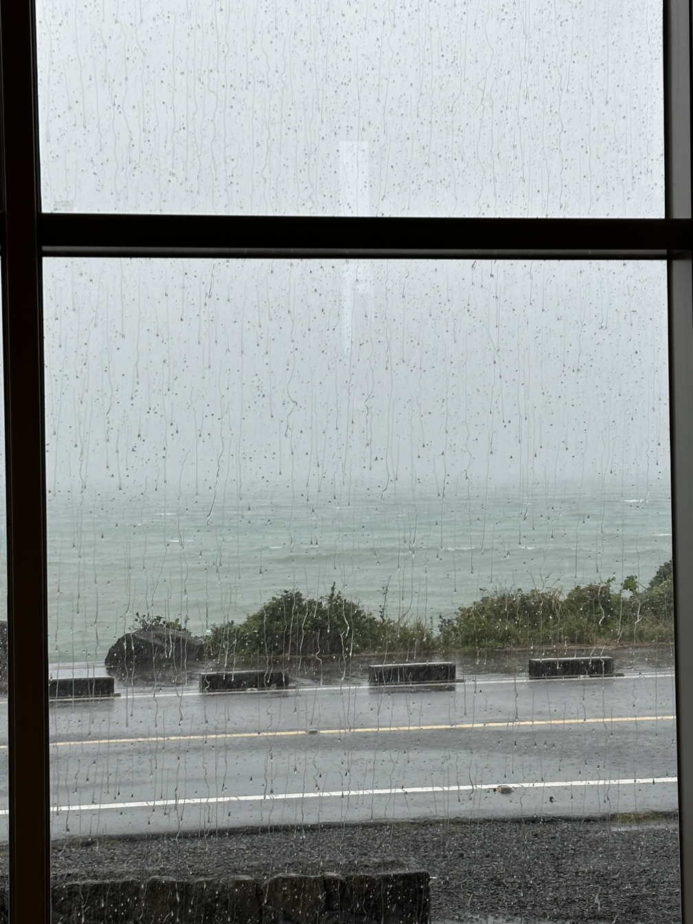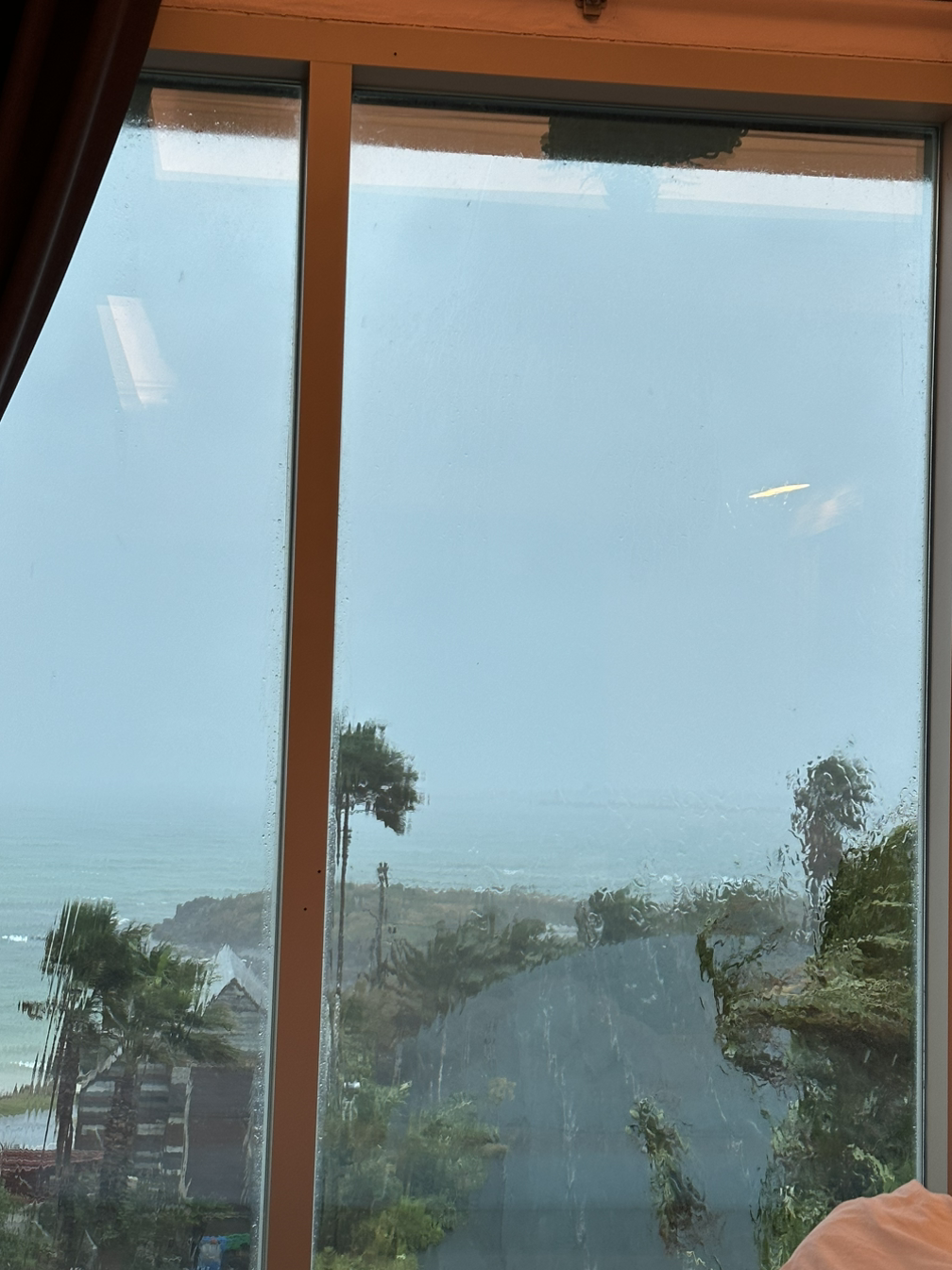 식당에 도착하니 내가 일등이었다. 내가 식당에 자리를 잡은 테이블은 바다가 잘 보이는 테이블이었다. 주변에 비가 계속 새고 있어 바닥이 좀 젖었지만, 테이블쪽은 괜찮았다.