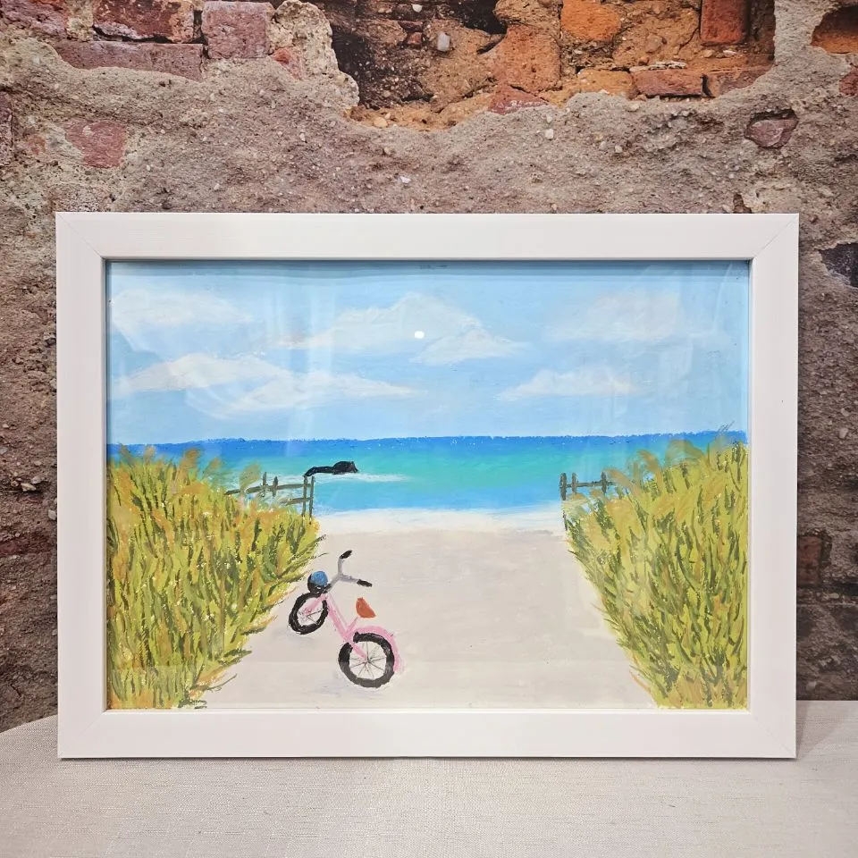 바탕을 칠하고, 구름을 표현하고, 파도를 표현하고, 갈대와 풀을 표현하고, 그 다음에 자전거를 그렸다.
