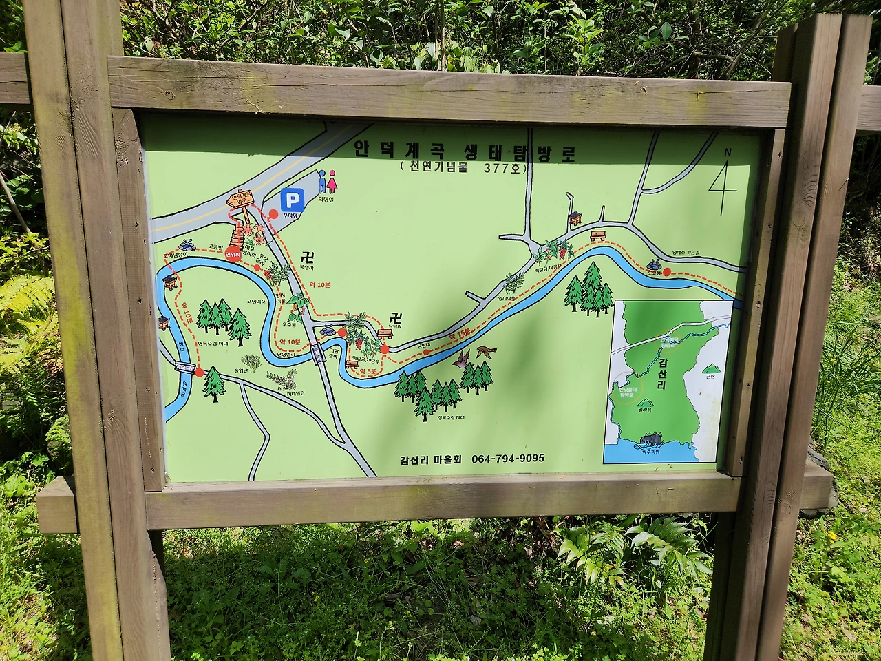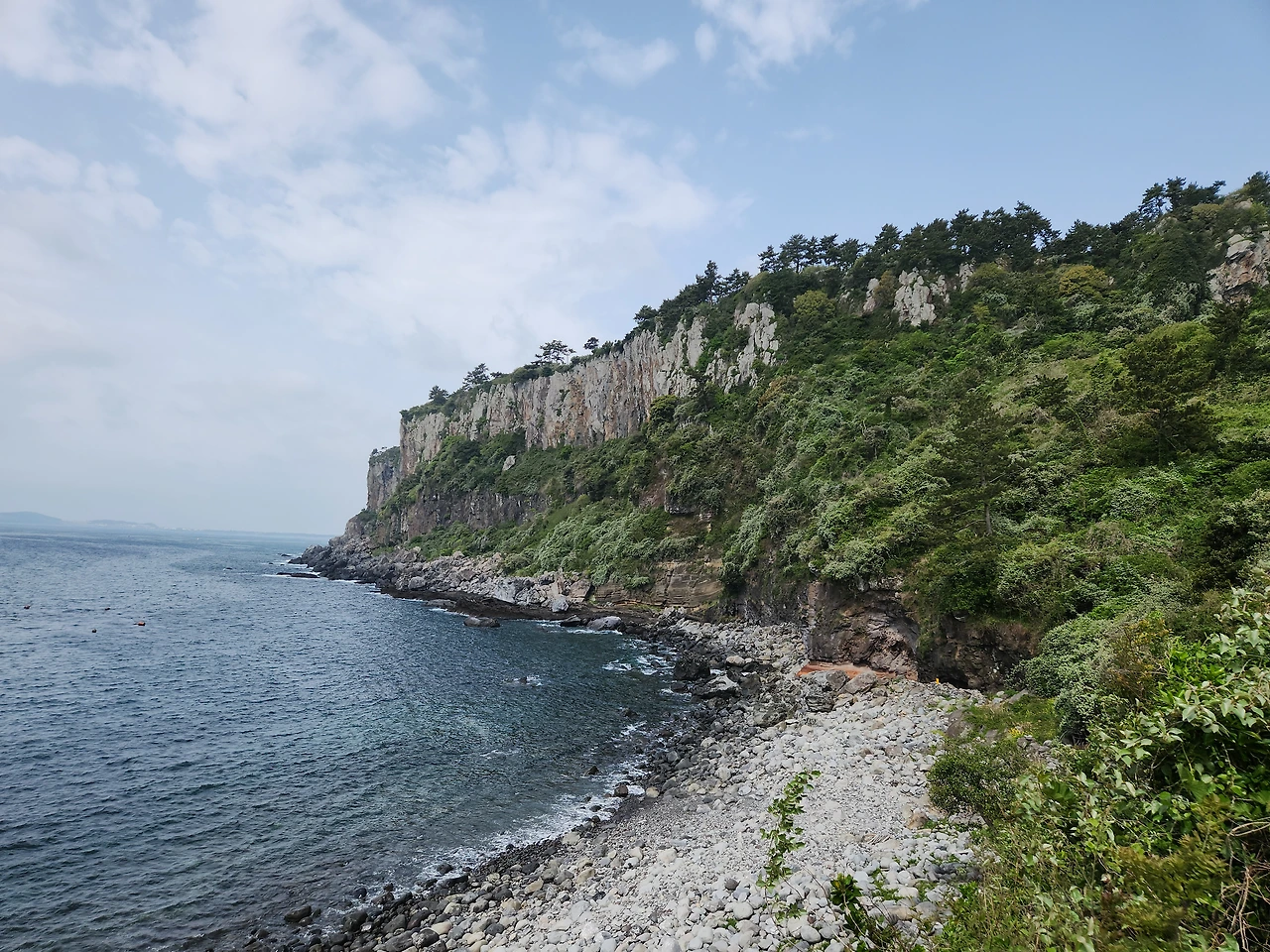 대평포구에서 9코스 시작인증 스탬프를 찍고 언덕으로 조금 걸어가니 박수기정이라는 깎아 만든듯한 절벽이 나타났다. 샘물이 솟아나는 절벽이라는 뜻이다. 위험해서 가로막은 안전망사이로 보니 샘물이 솟아난듯한 구멍이 절벽아래 보였다. 그 옆으로 말들이 다녔다는 좁디좁은 그러나 숲터널로 이루어진 오르막 오솔길이 있었다. 그 길을 몰질이라고 했다. 다시 걸음을 재촉하니 넓은 들이라는 뜻을 가진 난드르, 대평리가 나타났다. 밀감밭옆을 지나는 길을 따라 군산으로 들어섰다. 계단을 따라 300미터라는 군산 정상에 올라 중간 인증 스탬프를 찍고 내려오니 안덕계곡이 만들어 흐르고 있는 황개천이 있었다. 그러나 제주에서는 보기 드물게 물이 흐려서 궁금했다. 동네 중간쯤 자리 잡은 동네점빵에서 시원한 차 한잔을 마시고 힘을 내어 걷다 보니 들어선 어느 오솔길은 개인의 땅이었다. 올레꾼들에게 길을 내어준 밀감밭 크기가 어마어마했다. 울타리도 없이 그냥 지나도록 해준 주인장의 배려에 감사라는 단어만 생각났다.