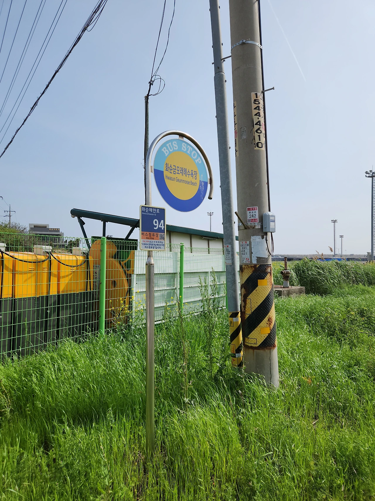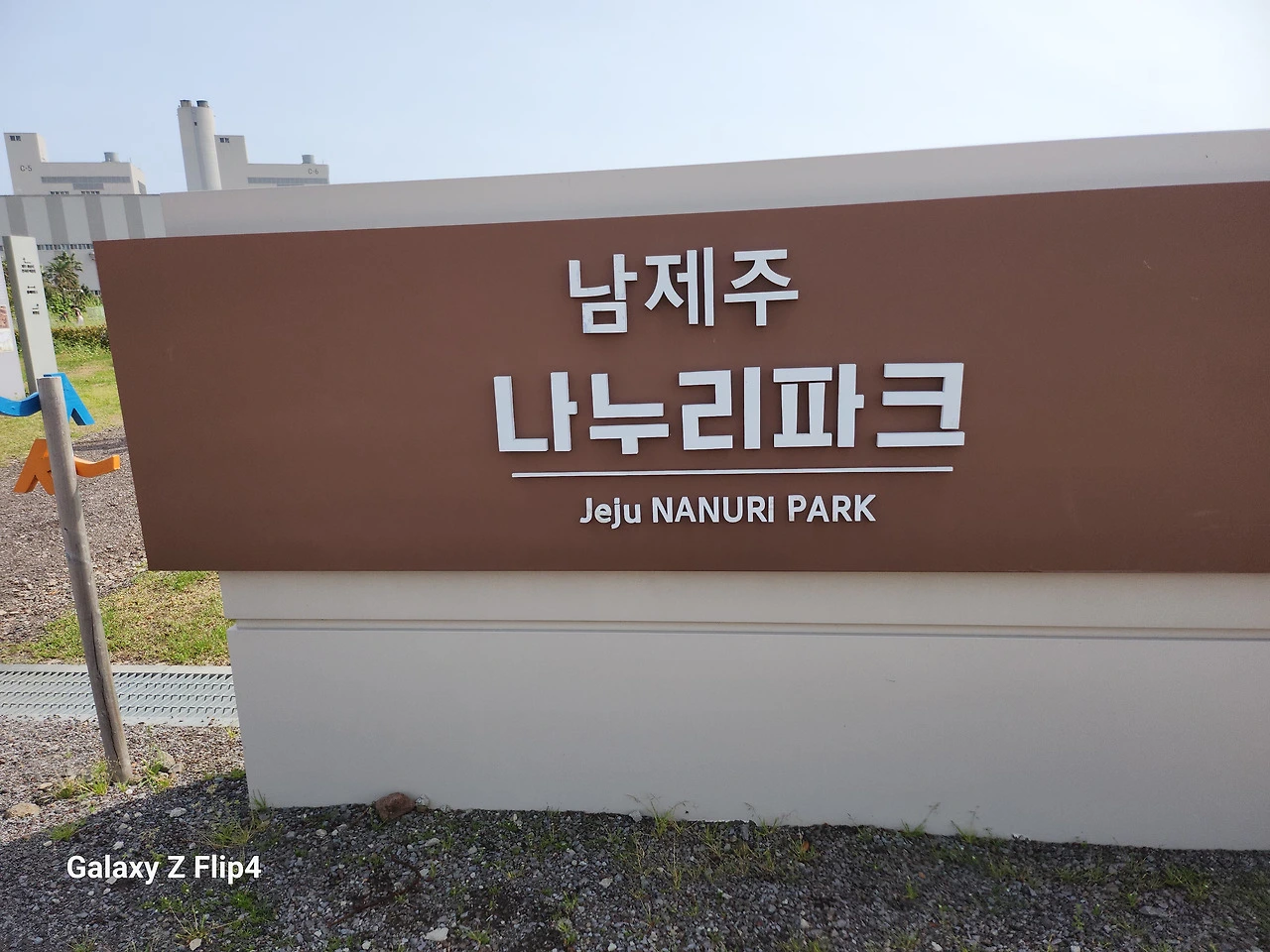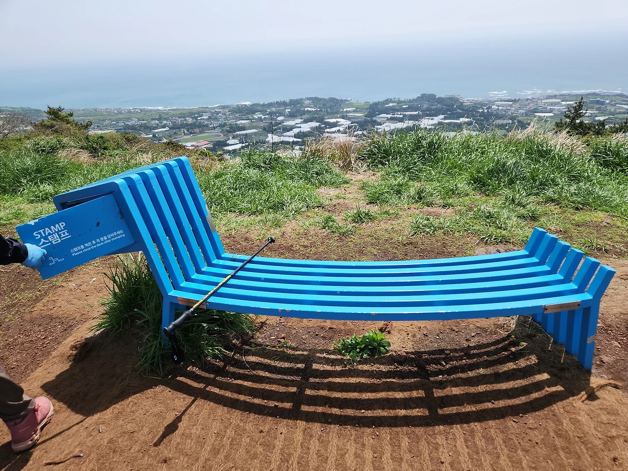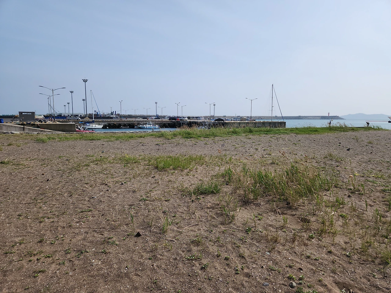 한참을 내려오니 제주남부전력소가 보였다. 제주 동네길을 걷다 보니 가정대문이나 차고에 개인자동차 전기충전기가 설치되어 있었다. 전력소를 보고 갑자기 그 시설이 왜 생각이 났을까? 전력소옆 넓은 쉼터에는 노오란 유채꽃이 가득 피어 있었으나 이길 저길에서 많이 보아 온 꽃이라 그냥 스치려니 굳이 남편이 사진을 찍어주었다. 800미터쯤 남은 종착점거리가 어찌 그리 멀던지 갈수록 나의 멘탈이 자꾸 흩트려지려고 했다. 종점인증스탬프를 찍고 모래사장 해수욕장을 둘러보니 젊은 텐트족들이 여기저기 보였다. 제주의 바닷가는 크고 작은 검은 돌들이 거의 자리 잡고 있는데 비하여 금모래로 이루어졌으니 귀한 해수욕장이다.