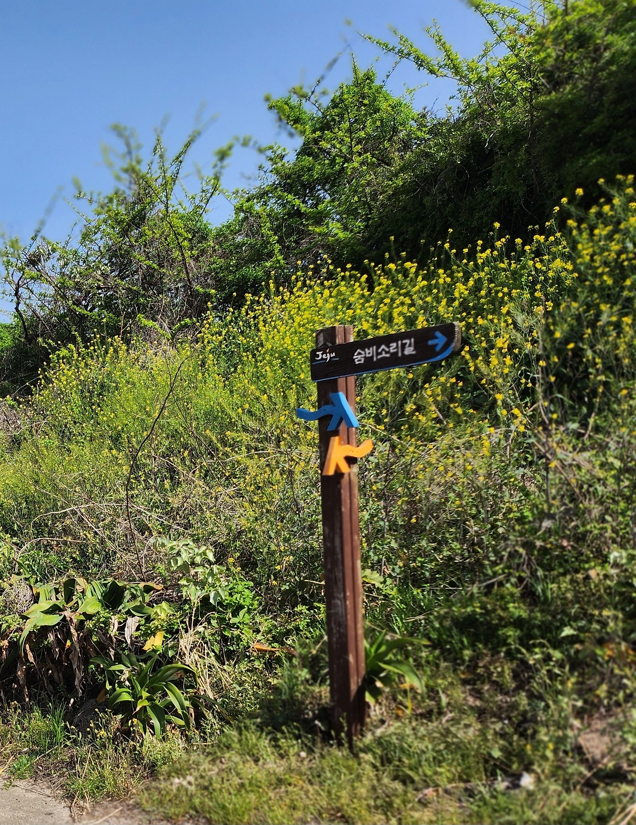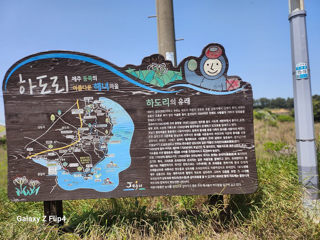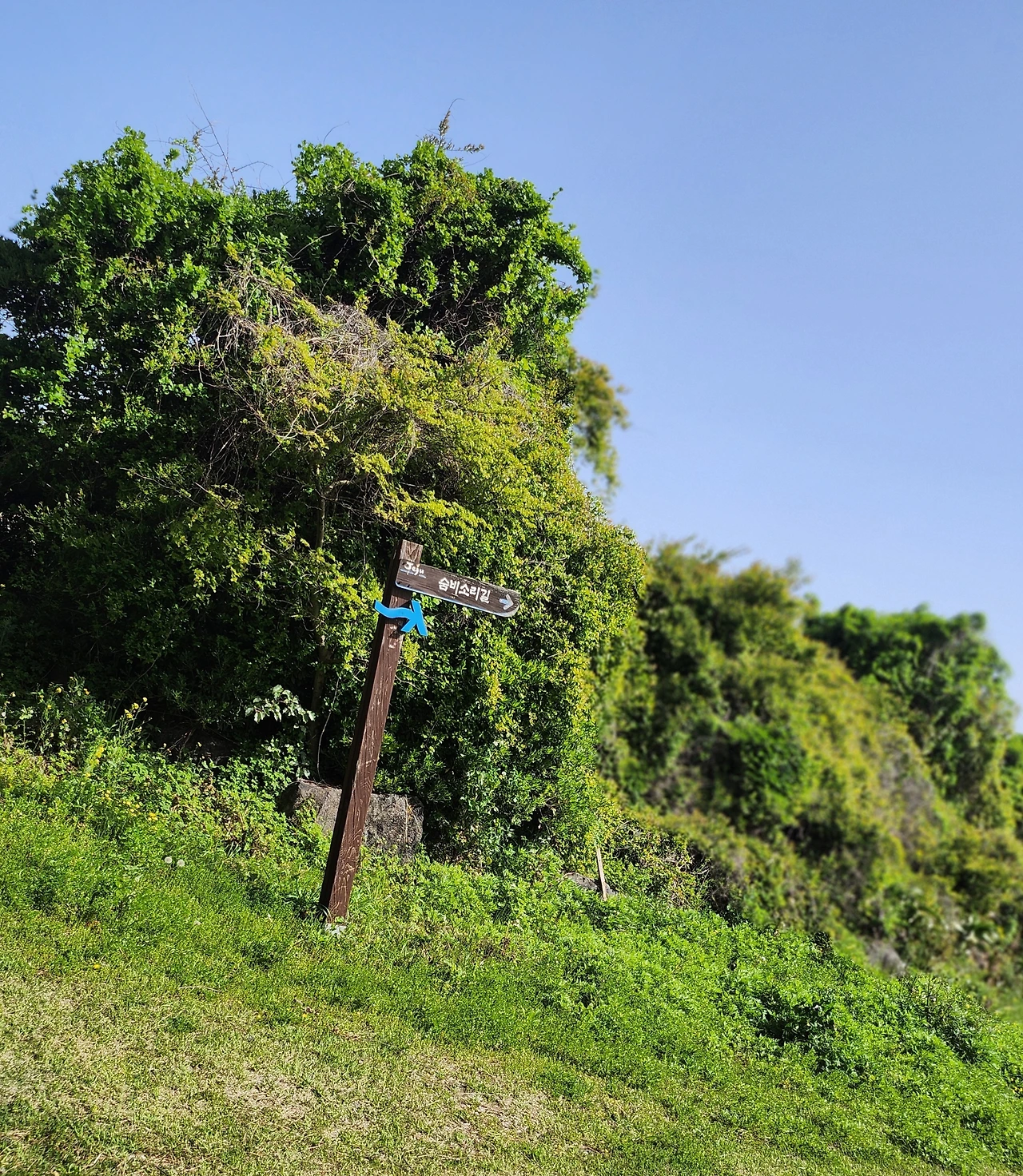 제주항일해녀기념비를 비롯하여 드넓은 박물관 주변을 살펴보고 왼쪽으로 방향을 트니 숨비소리길과 함께 연대동산이 나타났다. 제주 곳곳에는 연기나 횃불로 신호를 주고받았던 연대동산의 흔적이 많은 편이었다. 올레길과 숨비소리길 사이로 이름 모를 야생화가 하얗게 흐드러져 피어있었고 드넓은 평지에는 축구장이 깔끔하게 정비되어 있었으나 둘러봐도 집들은 보이지 않았다.주택들이 드물게 있었고 감자와 무밭들을 지나 바닷가를 따라 걷다 보니 해녀들의 쉼터이자 옷을 갈아입고 해녀교육까지 실시했다던 크고 작은 불턱이 눈에 띄었다. 해안가를 주욱 따라 걸으니 왜구를 방어하기 위해 세웠다는 별방진이 나타났다. 다시 걷다 보니 석다원이라는 식당 앞에 중간스탬프 찍는 곳이 나타났다. 인증을 하고 나니 다시 힘이 났다. 갯용여부인을 모시는 신당이며 해산물의 풍요와 해녀들의 안녕을 기원한다는 각시당을 지나니 하도 환해장성에 도착했다. 멀리 하도항에서 무지개빛깔로 색칠된 여객선이 떠나는 모습도 보였다.