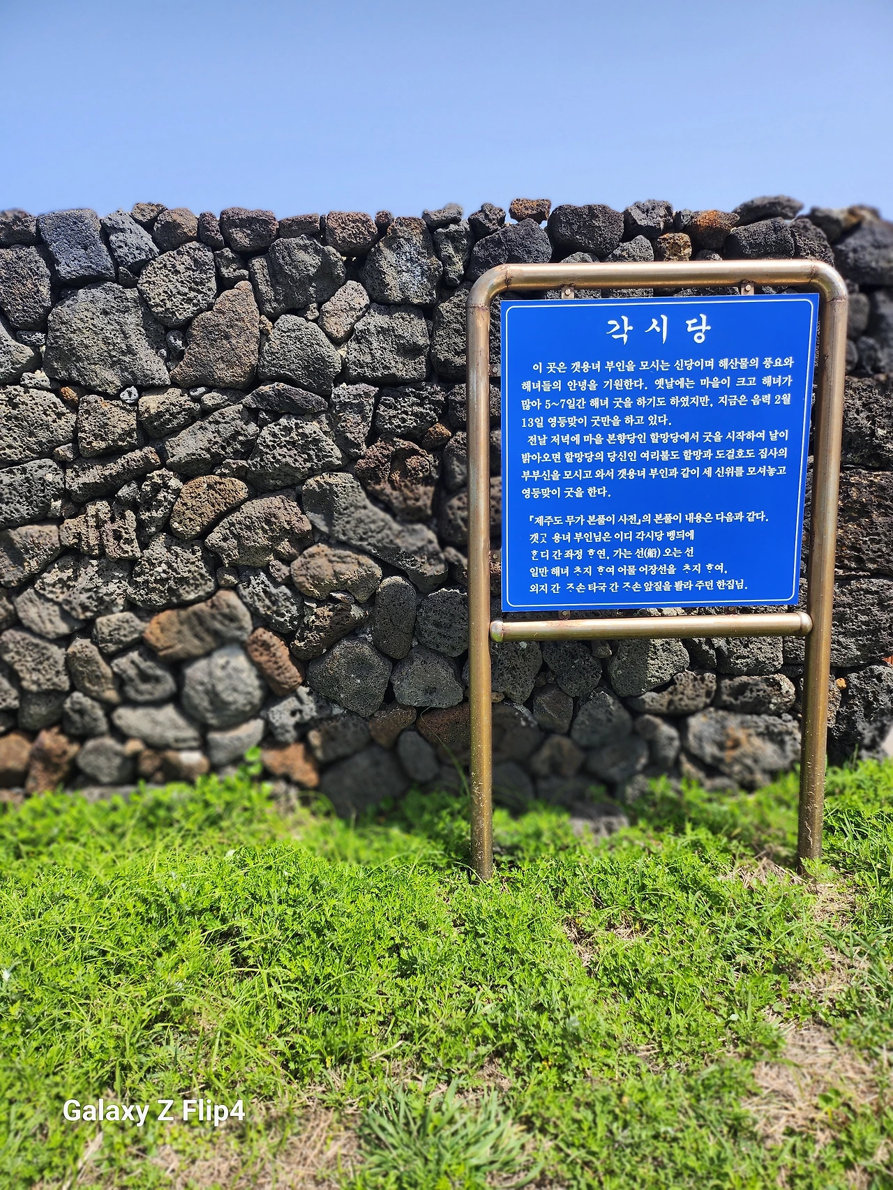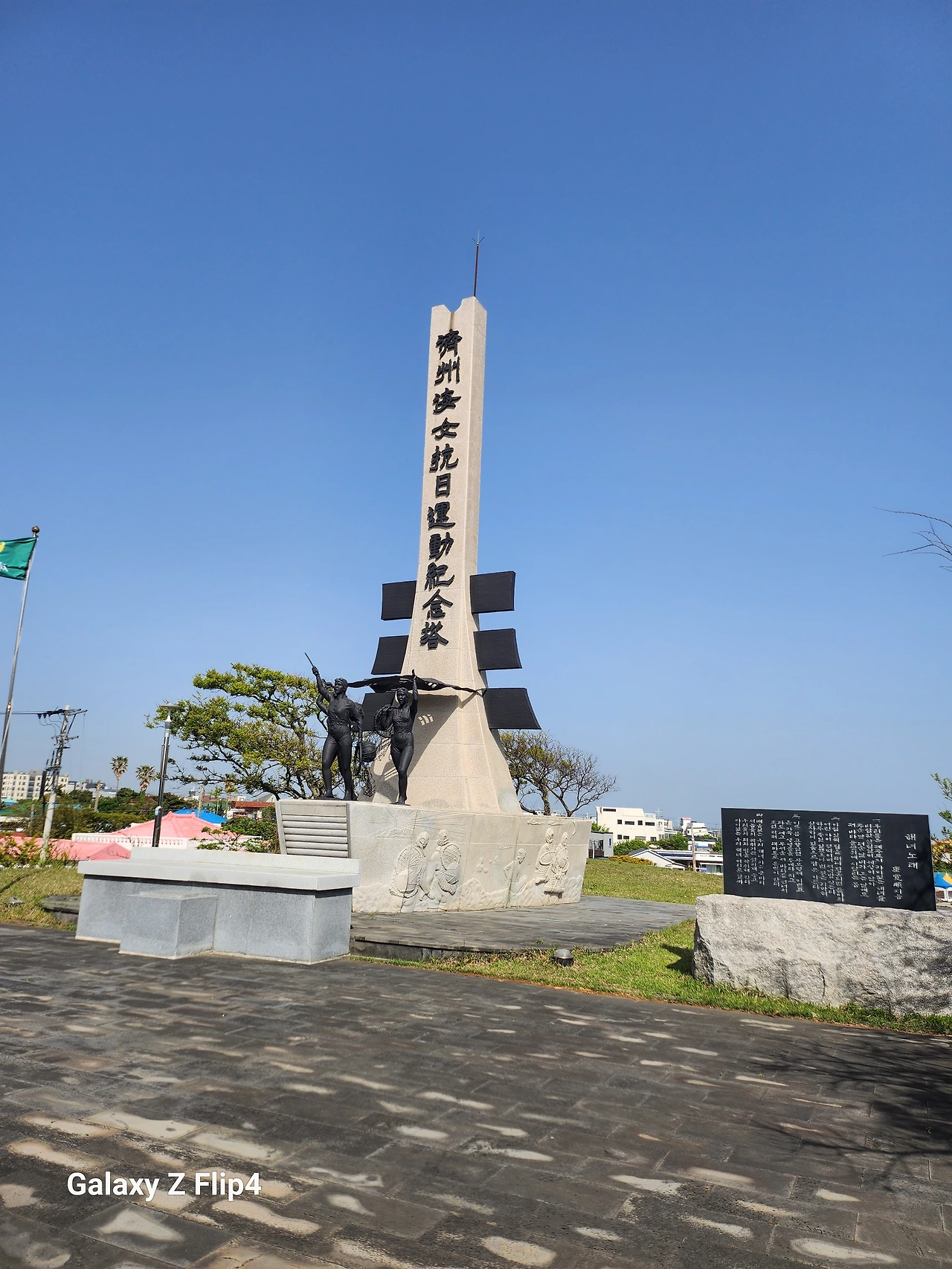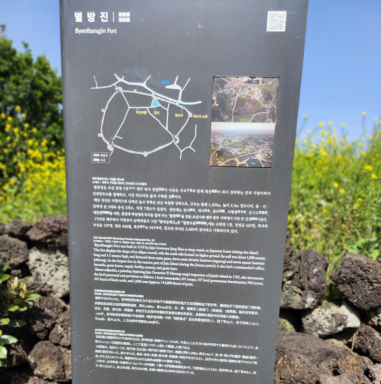 제주항일해녀기념비를 비롯하여 드넓은 박물관 주변을 살펴보고 왼쪽으로 방향을 트니 숨비소리길과 함께 연대동산이 나타났다. 제주 곳곳에는 연기나 횃불로 신호를 주고받았던 연대동산의 흔적이 많은 편이었다. 올레길과 숨비소리길 사이로 이름 모를 야생화가 하얗게 흐드러져 피어있었고 드넓은 평지에는 축구장이 깔끔하게 정비되어 있었으나 둘러봐도 집들은 보이지 않았다.주택들이 드물게 있었고 감자와 무밭들을 지나 바닷가를 따라 걷다 보니 해녀들의 쉼터이자 옷을 갈아입고 해녀교육까지 실시했다던 크고 작은 불턱이 눈에 띄었다. 해안가를 주욱 따라 걸으니 왜구를 방어하기 위해 세웠다는 별방진이 나타났다. 다시 걷다 보니 석다원이라는 식당 앞에 중간스탬프 찍는 곳이 나타났다. 인증을 하고 나니 다시 힘이 났다. 갯용여부인을 모시는 신당이며 해산물의 풍요와 해녀들의 안녕을 기원한다는 각시당을 지나니 하도 환해장성에 도착했다. 멀리 하도항에서 무지개빛깔로 색칠된 여객선이 떠나는 모습도 보였다.