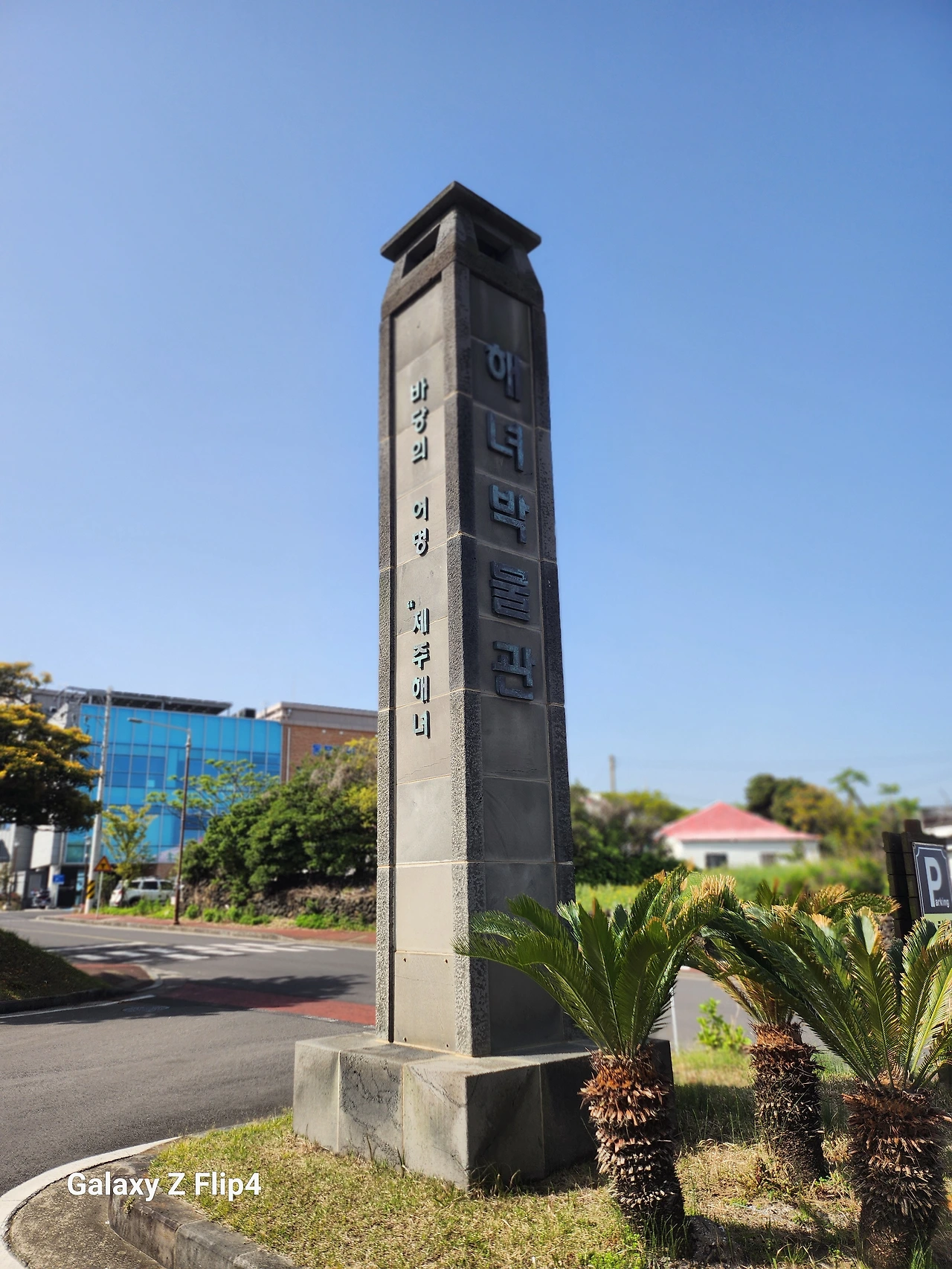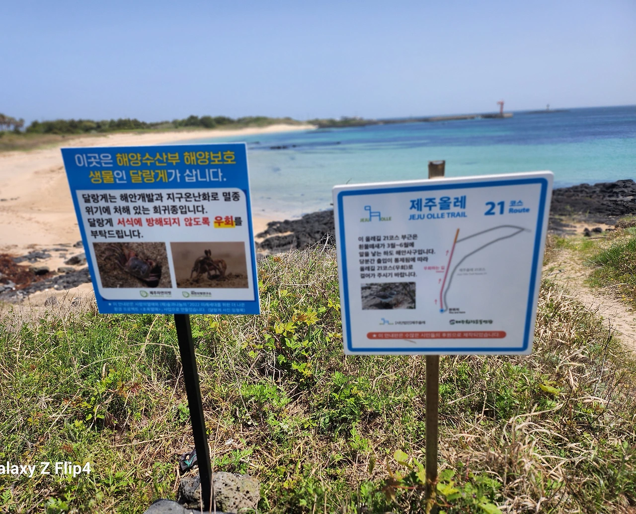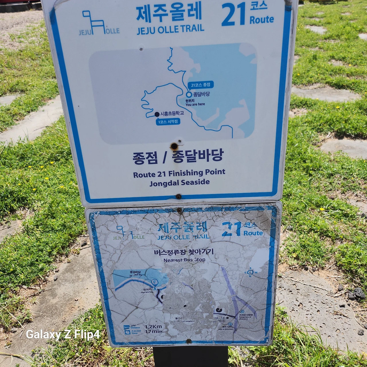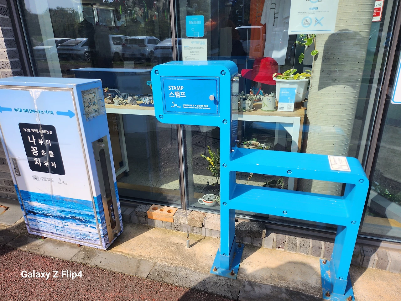 4월 18일 목요일 제주한달살이 18일 차. 오늘은 순서를 바꾸었다. 이유는 성산읍에 위치한 우리 숙소에서 10코스 서남쪽까지 가고 오는데 시간이 너무 많이 걸렸었다. 그래서 숙소에서 가까운 21코스부터 순서를 바꾸어 걸었다. 꼭 숫자 순서대로 걸어야 한다는 규정은 없으므로 우리 편의대로 결정했다. 21코스는 구좌읍 세화리에 위치한 해녀박물관 앞 올레코스안내소에서 출발하여 종달 바닥종점까지 11.3킬로였다. 해녀박물관주차장에 차를 세워두고 출발 스탬프를 찍었다.