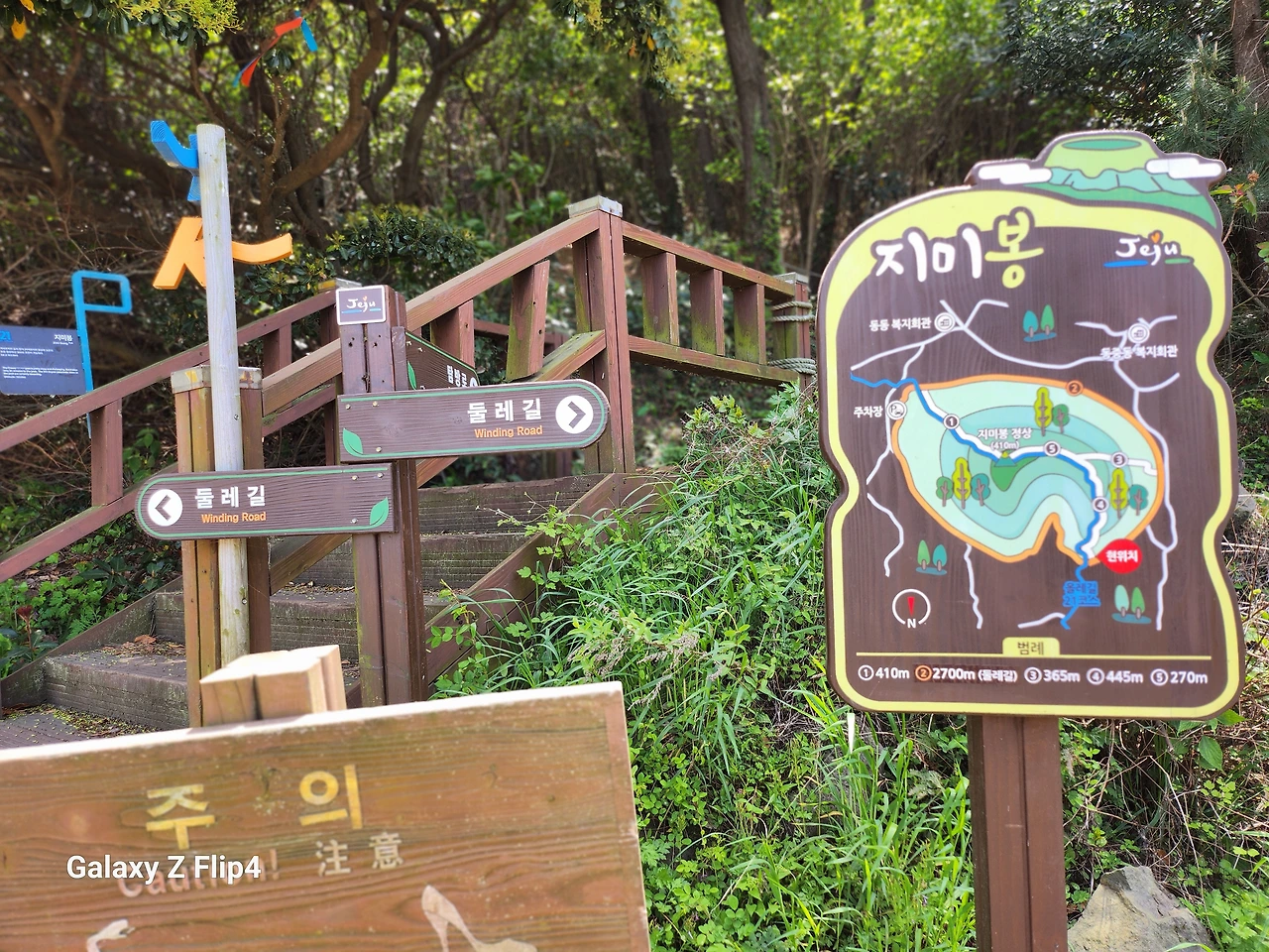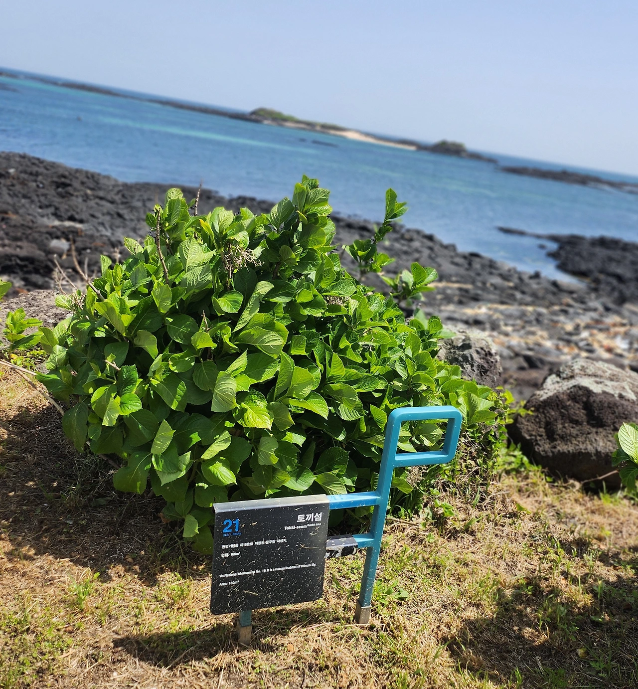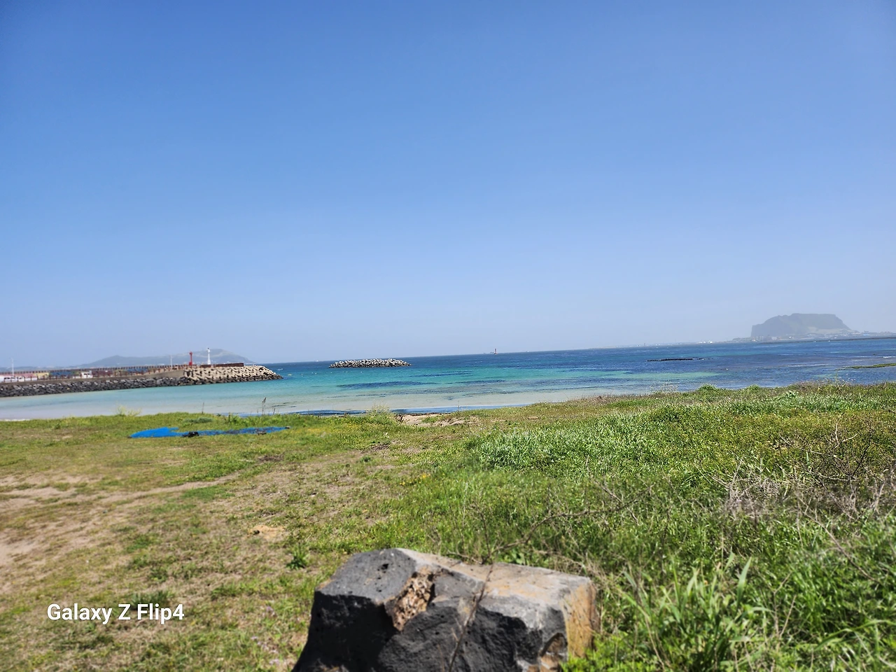 해안길을 걷다 보니 왼쪽 저 멀리 토끼섬이라는 곳이 보였다. 여름이면 문주란이 하얗게 피어 토끼처럼 보였다는 설도 있고 옛날에는 토끼가 많았다는 설이 있으나 지금은 토끼가 없다고 한다. 물빛이 고운 하도해수욕장을 지나 밭사이로 난 오솔길을 걸으니 땅끝이라는 뜻을 가진 지미봉 입구가 나타났다. 아, 입구부터 정말 가파른 오름이었다. 우리는 쉼터에서 준비한 빵을 먹고 다시 정상에 오르니 멀리 우도와 성산일출봉이 보였다. 다시 내려오는 길도 완전 급경사여서 우리는 스틱에 의존하여 조심스레 한 발씩 내디뎠다. 정자에서 다시 물 한 모금을 마시고 걸으니 종달항이 보였다.