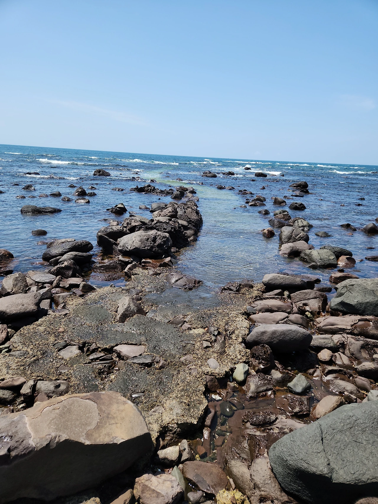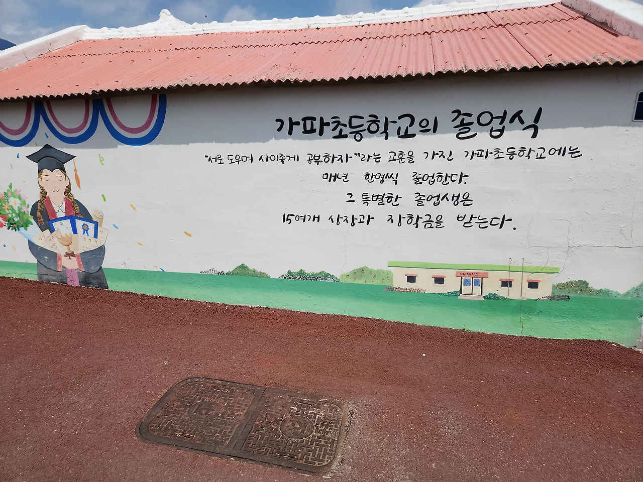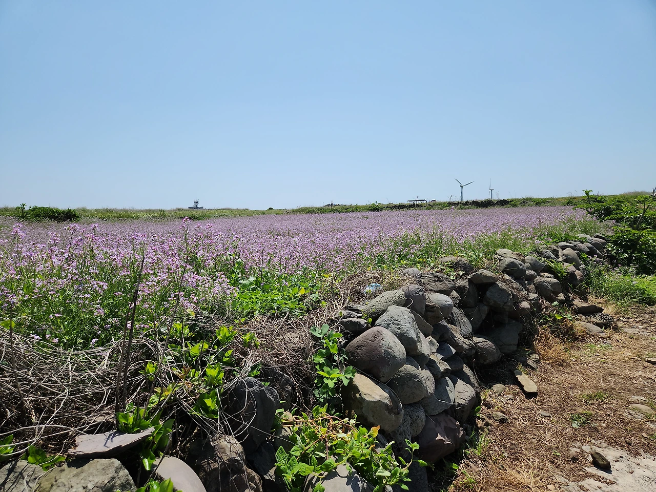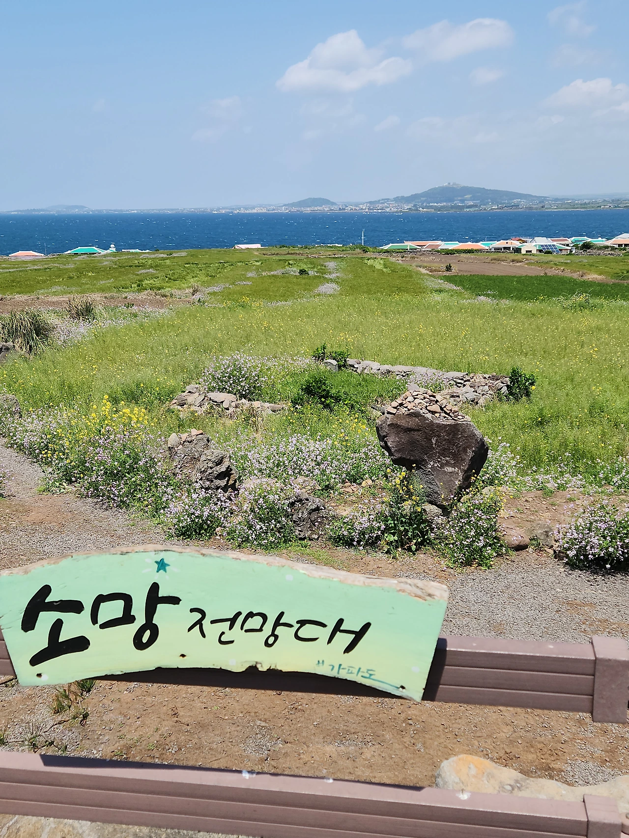우리는 상동마을 할망당을 거쳐 보름바위라는 큰 왕돌을 지나 왼쪽으로 언덕을 오르니 푸른 청보리와 연보랏빛 갯무꽃이 어우러져 장관이었다. 그야말로 남녀노소 구분없이 사진을 찍고 있었다. 사방팔방으로 뚫린 가파도 주변에는 멀리 산방산을 비롯하여 형제섬과 마라도가 지척에서 흔들리고 있었다. 카페에 들러 구수한 보리미숫가루와 보리가루꽈배기로 입가심을 하고 왼쪽으로 걸으니 해안가 개엄주리코지에 어멍, 아방 바위가 나란히 서 있었다. 가파도에는 큰 바위 위에 올라가면 엄청난 파도가 밀려오기 때문에 삼간다는 이야기가 적혀있었다. 가파리마을제단을 지나고 하동에 위치한 가파치안센터(파출소)앞에 도착해서 최종도착인증 스탬프를 찍었다. 가파포구를 한 바퀴 돌고 오니 아담하고 정겨운 가파초등학교가 나왔다. 1년에 1명씩 졸업생을 배출한다고 한다. 나는 학교만 나오면 가슴이 두근거린다. 부디 이 학교 아이들 건강하게 자라서 큰 일꾼들이 되기롤 빌었다. 가파도 특산물인 보리로 미숫가루를 만들고 보리누룽지, 보리뻥튀기 등을 만드는 보리도정공장에 들러 보리미숫가루와 보리누룽지를 샀다. 우리는 둘 다 시골 입맛이라서 이런 것들을 좋아한다. 내려오는 상동마을길에 옛 우물터를 발견하였다. 살아가는데 가장 필요한 것이 물이다. 이 우물 따라 동네가 형성되었으리라. 동네길목마다 빈집을 개조하여 카페를 비롯하여 작은 공방을 만들어 놓고 소소한 물건을 판매하고 있었다. 오전 11시 20분 배로 들어갔다가 오후 2시 50분 배로 나왔다. 뭔가 아쉬운 듯 자꾸 뒤돌아본 가파도였다.