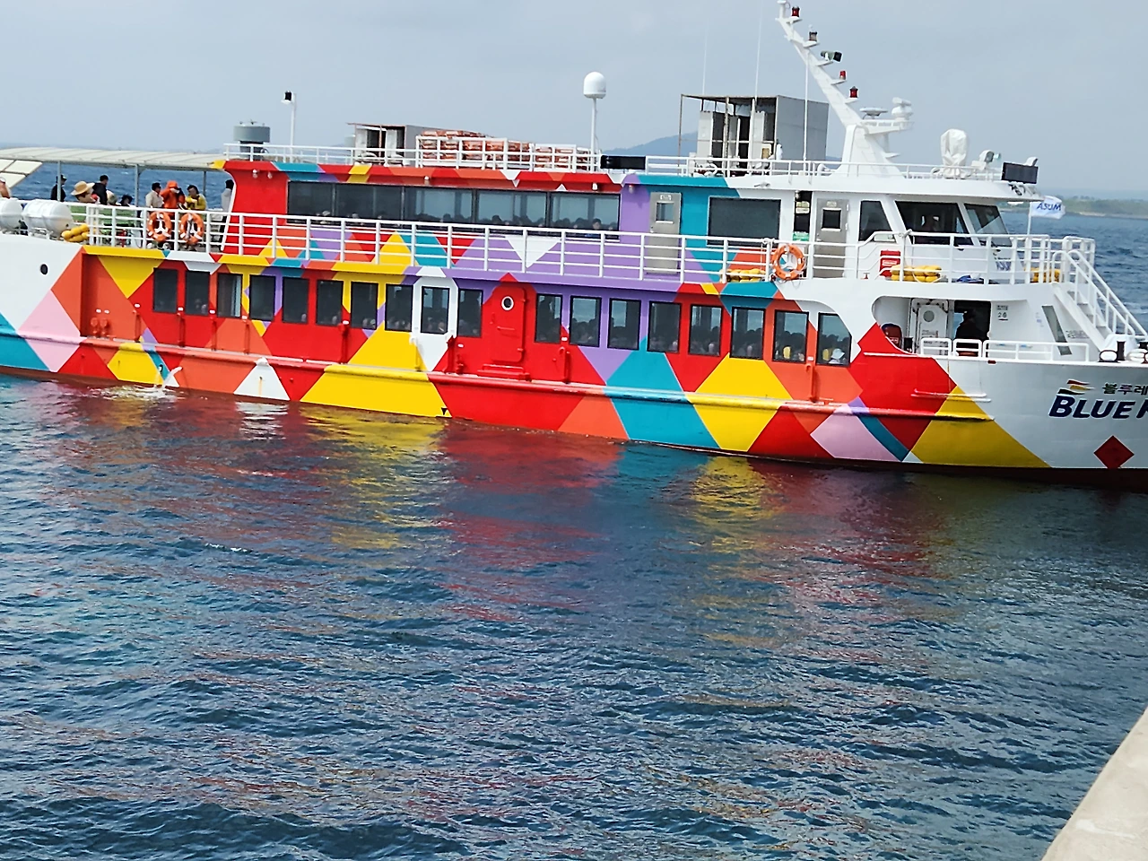 숙소 성산읍에서 2시간 달려 운진항에 도착하였다. 10시에 도착하였는데 벌써 주차장은 꽉 차서 헤매다가 찬스, 한 자리가 나서 주차하고 보니 아뿔싸, 또 표 예매줄이 구불구불하였다. 미리 예약하자니 굳이 가서 하자던 남편의 의견을 따랐더니 남편은 괜히 미안해했다. 나의 올레길인증 수첩과 경로우대 65세 이상 남편의 신분증을 참고하더니 아주 조금 할인을 해 주었다. 백수인 우리는 요런 할인 사항을 사용할 줄 안다. 돈 몇천 원 할인 대상에 좋아해야 할사안인지 슬퍼해야 할 사안인지 모르겠다. 운진항에서 배 시동 걸고 출발한 지 딱 10분 지났는데 벌써 가파도에 도착했단다. 바람이 거세게 불고 피부에 와닿는 온도가 서늘했다.