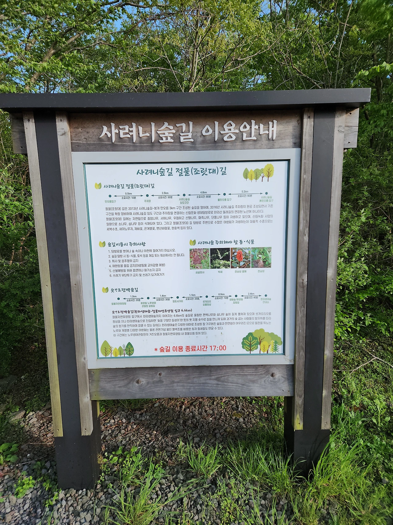 다시 핸들을 [사려니 숲길]로 돌렸다. 어차피 숙소로 돌아가는 길에 있어서 유명한 곳이니 남은 시간을 활용하기로 하였다. 오후 5시까지는 숲에서 나와야 하는 규정이 있는데 주차장에 도착하니 4시 15분을 넘어서고 있었다. 바로 걸었다. 옆에는 한라산 둘레길도 있었으나 우리는 사려니숲길이 목표다. 혹시라도 늦은 시간에 도착할까 봐 헉헉거리며 바삐 걸었다. 다양한 나무들이 멋지게 쑥쑥 자라 늘씬한 자태를 뽐내고 있었는데 유독 육지의 잎이 좁은 조릿대와는 다르게 잎이 넓은 조릿대가 오솔길옆에서 내 눈길을 끌었는데 아무래도 따뜻한 기온의 영향이라고 추측했다. 코를 벌름거리며 마음껏 들이마시고 내뿜으며 휠링의 시간을 누린 것 같다. 남은 자투리 시간까지 제주를 느낀 오늘 하루였다.