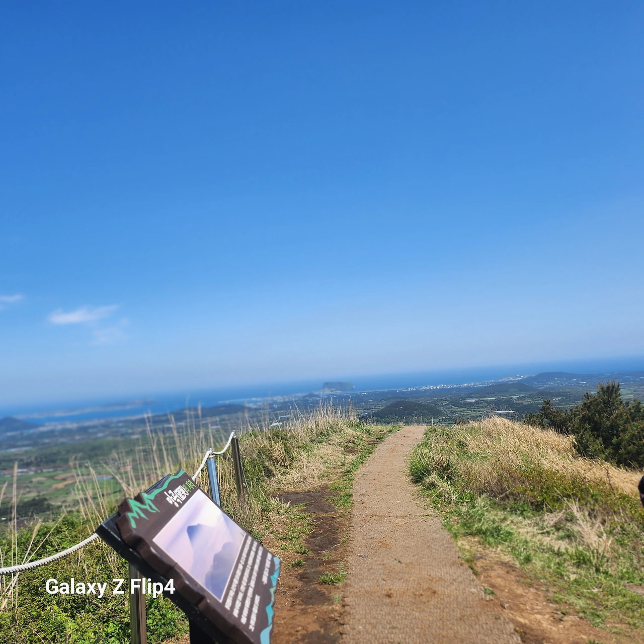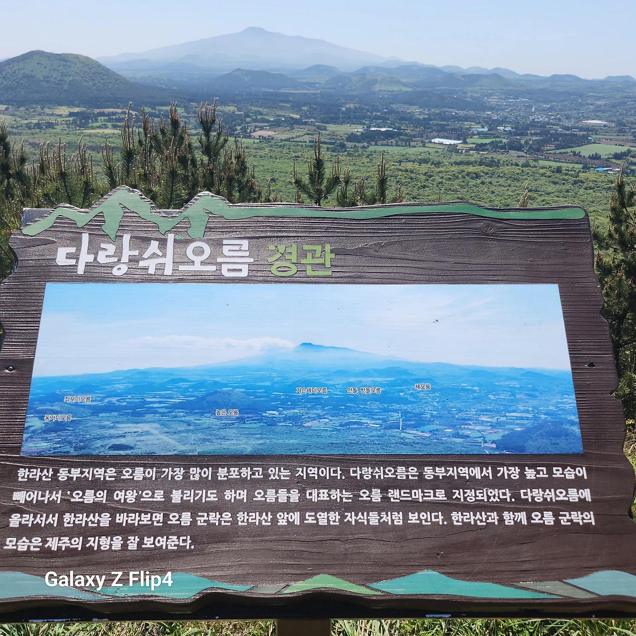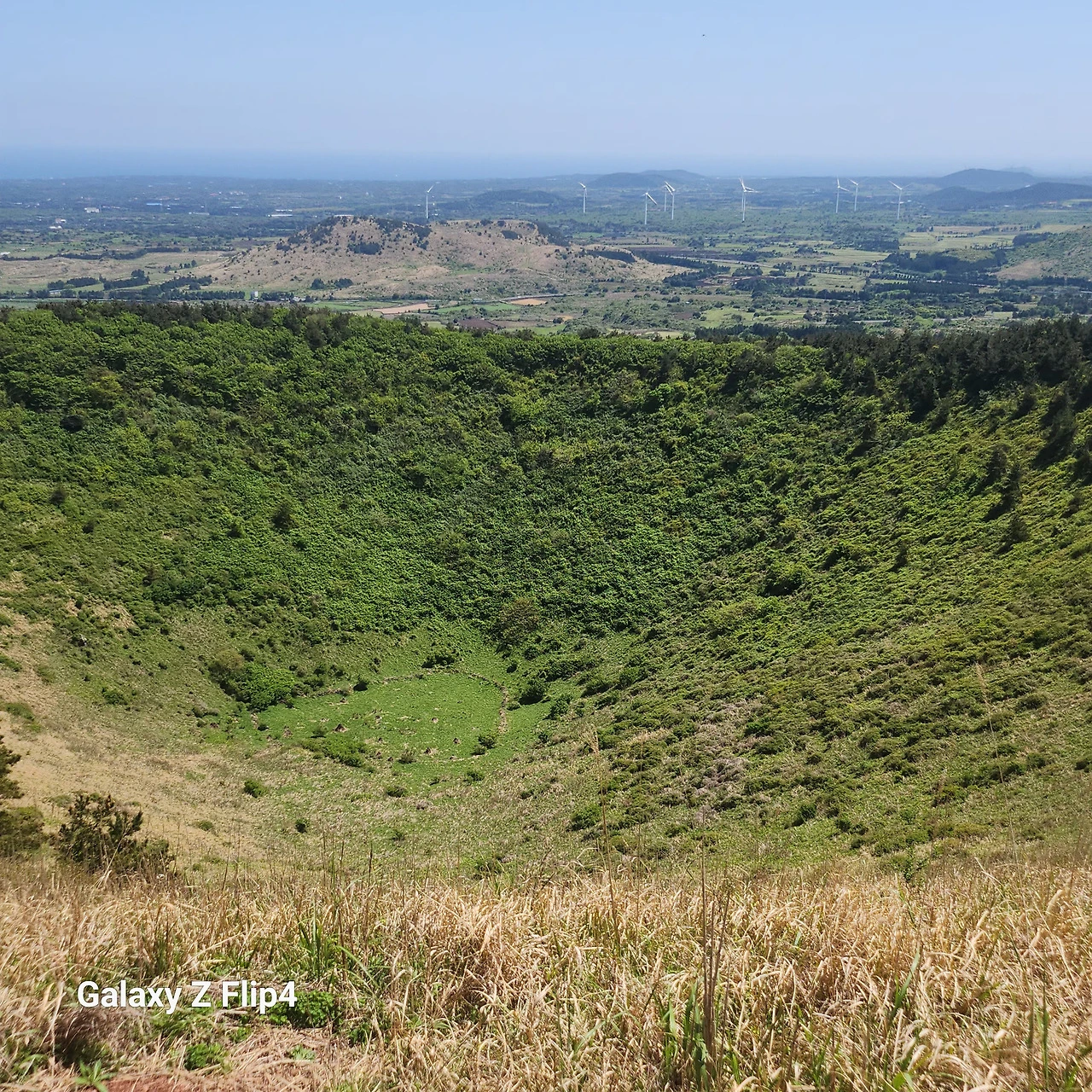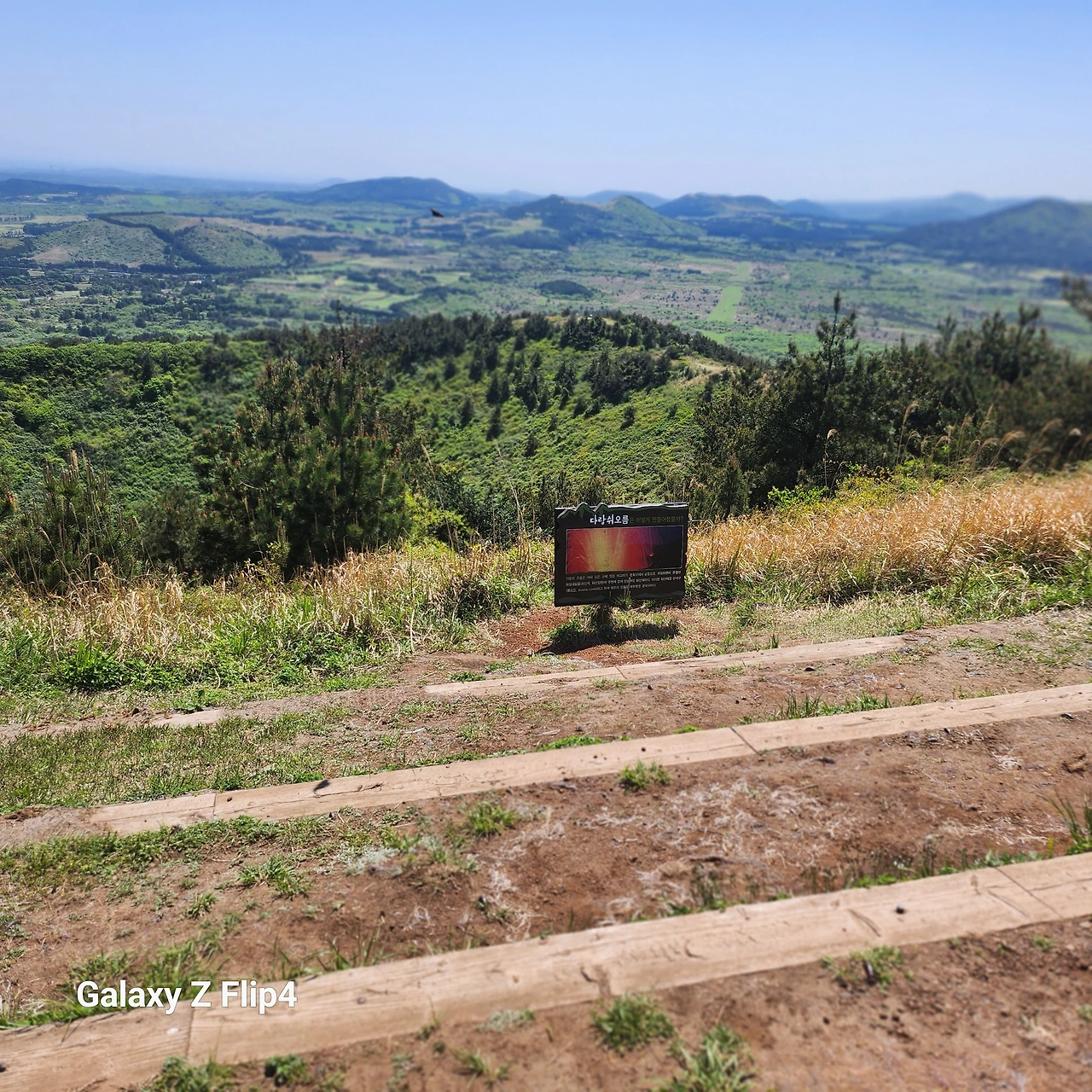 30여분을 달려 [다랑쉬오름]에 도착했다. 입구에서부터 급경사 계단으로 이루어졌다. 힘들 것 같아서 어제 가파도에서 산 보리꽈배기를 차에서 먹었다. 달달하고 구수한 것이 힘이 나게 했다. 스틱까지 준비하고 오르는데 진짜 너무 힘들어서 포기하고 싶었다. 남편은 뒤도 안 돌아보고 날다람쥐처럼 오르고 있었다. 몇몇 여자분들은 포기하고 뒤돌아 내려가고 있었다. 평소에도 계단으로 이루어진 곳은 너무 힘들고 싫었다. 야속한 남편의 뒷모습이지만 그래도 69세의 나이에도 당당하게 오르는 모습에 나도 깡을 발휘했다. 30여 분을 헉헉거리며 오르고보니 아, 완전 반전의 광경을 펼쳐 주었다. 수목에 가려 보이지 않던 오름의 정상에는 움푹 파인 분화구로 인하여 아슬아슬한 높이 저 아래로 또 다른 세상을 만들어내고 있었다. 아, 포기하고 안 올라왔더라면 이런 호사스러움을 모르고 갔겠구나 싶어서 여기를 선택한 남편에게 엄지 척을 하였다. 전망대에서 사방을 둘러보니 희뿌연 안개를 허리에 두른 한라산이 저만치서 내려보고 있고 높고 낮은 수십 개의 오름이 빙 둘러있다. 내려오려니 아쉬웠다. 이런 멋진 것들을 두고 이제 곧 육지로 가야 하나 싶었다.