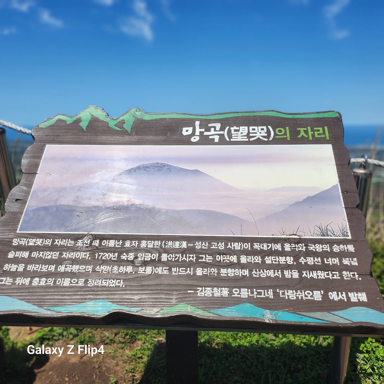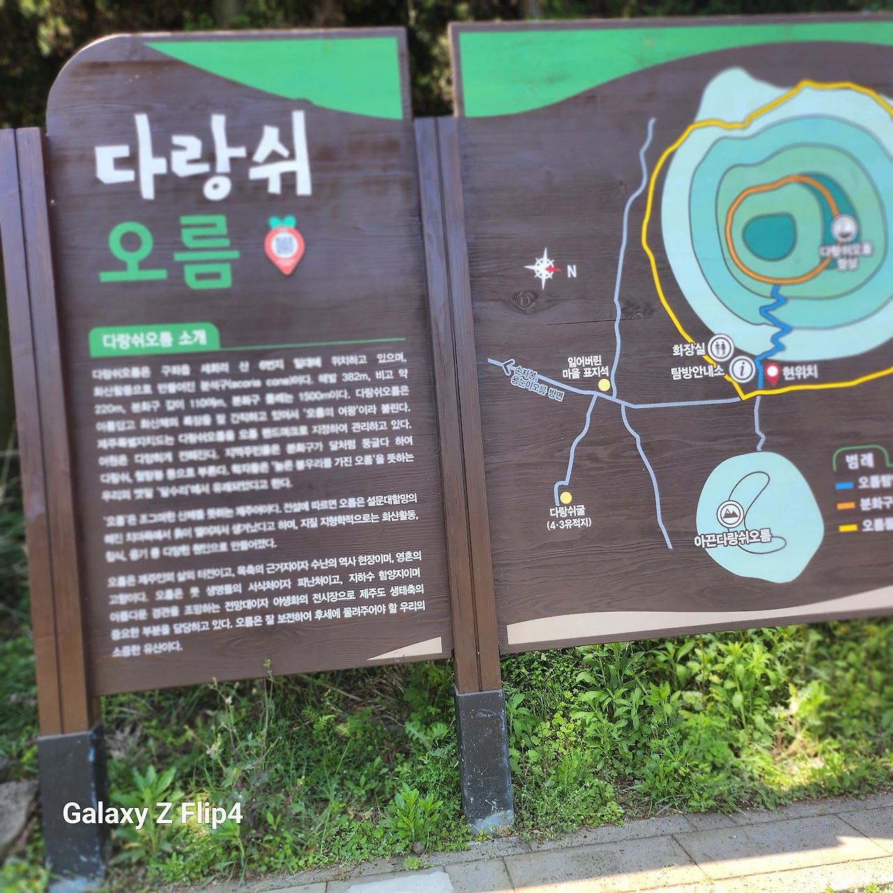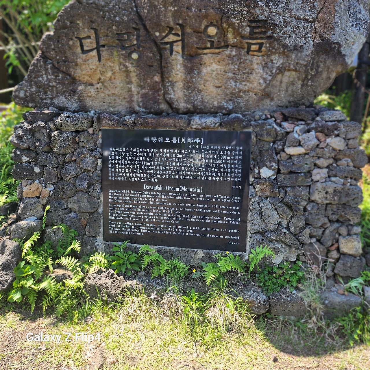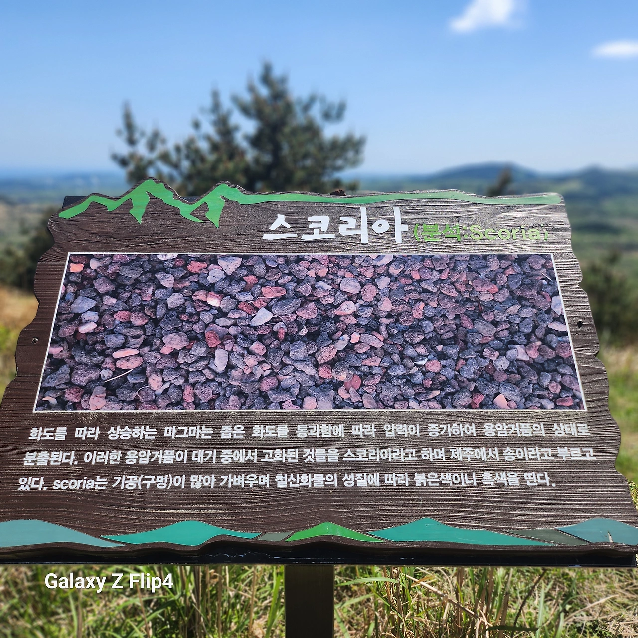 30여분을 달려 [다랑쉬오름]에 도착했다. 입구에서부터 급경사 계단으로 이루어졌다. 힘들 것 같아서 어제 가파도에서 산 보리꽈배기를 차에서 먹었다. 달달하고 구수한 것이 힘이 나게 했다. 스틱까지 준비하고 오르는데 진짜 너무 힘들어서 포기하고 싶었다. 남편은 뒤도 안 돌아보고 날다람쥐처럼 오르고 있었다. 몇몇 여자분들은 포기하고 뒤돌아 내려가고 있었다. 평소에도 계단으로 이루어진 곳은 너무 힘들고 싫었다. 야속한 남편의 뒷모습이지만 그래도 69세의 나이에도 당당하게 오르는 모습에 나도 깡을 발휘했다. 30여 분을 헉헉거리며 오르고보니 아, 완전 반전의 광경을 펼쳐 주었다. 수목에 가려 보이지 않던 오름의 정상에는 움푹 파인 분화구로 인하여 아슬아슬한 높이 저 아래로 또 다른 세상을 만들어내고 있었다. 아, 포기하고 안 올라왔더라면 이런 호사스러움을 모르고 갔겠구나 싶어서 여기를 선택한 남편에게 엄지 척을 하였다. 전망대에서 사방을 둘러보니 희뿌연 안개를 허리에 두른 한라산이 저만치서 내려보고 있고 높고 낮은 수십 개의 오름이 빙 둘러있다. 내려오려니 아쉬웠다. 이런 멋진 것들을 두고 이제 곧 육지로 가야 하나 싶었다.
