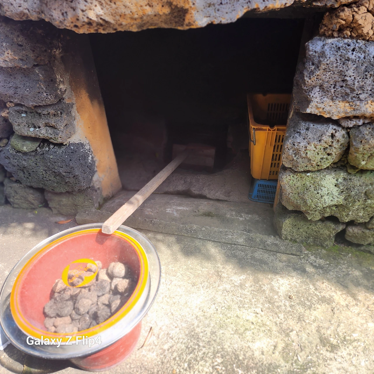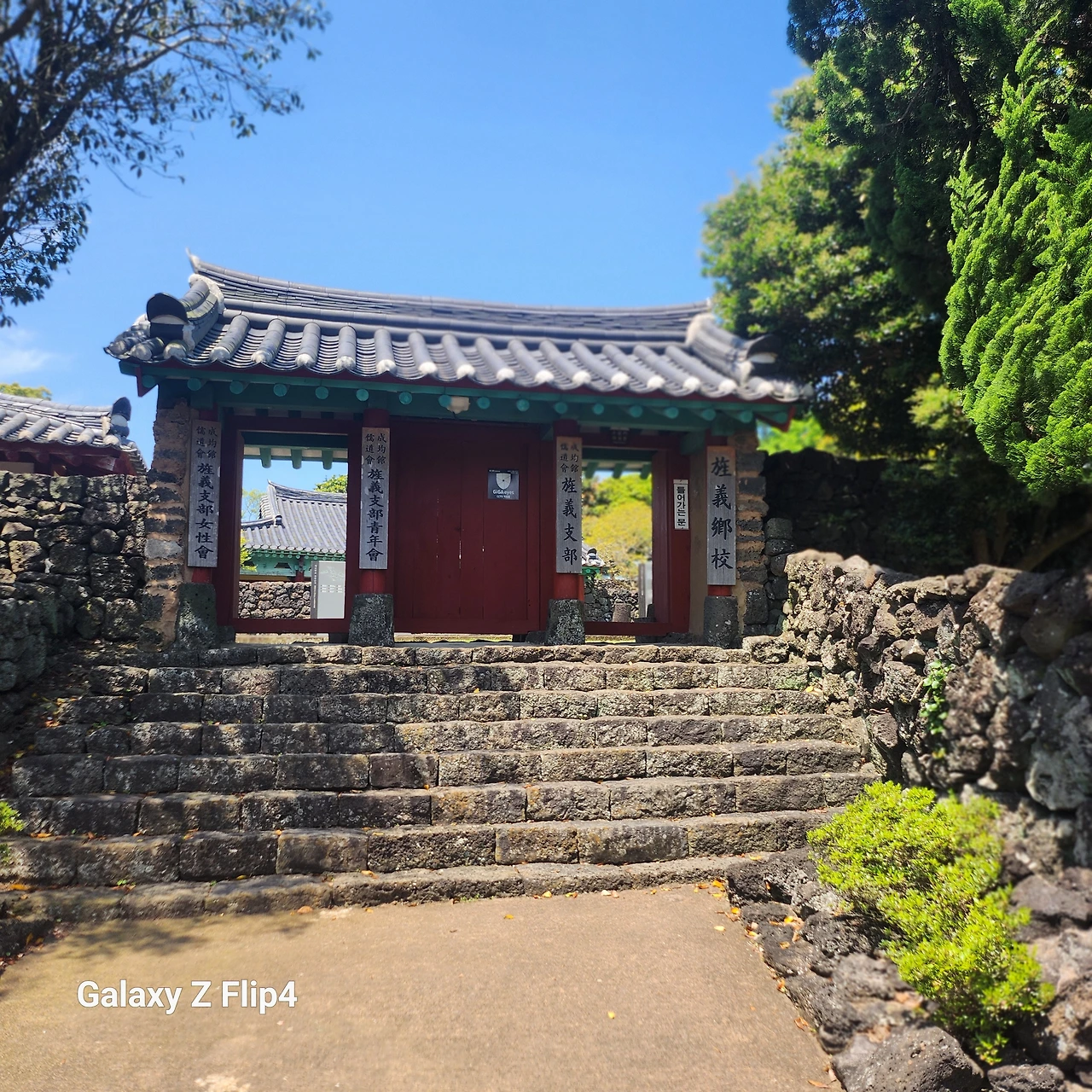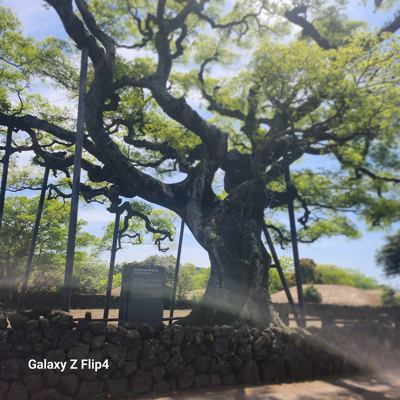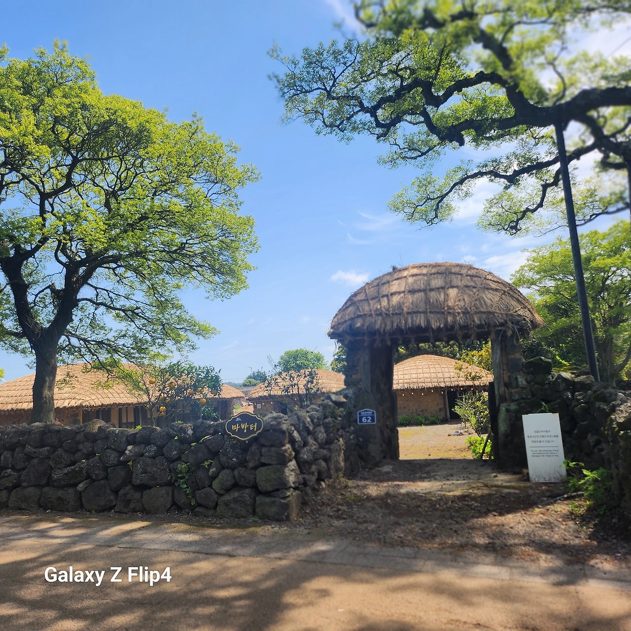 오늘 목적지 [성읍민속마을]에 도착했다. 향토문화해설사님이 기다리고 있었다. 현재 사람이 살고 있는 허가된 집에 들어서며 구수한 억양과 알아듣기 쉬운 설명으로 서민들의 일상모습을 안내해 주었다. 입구에는 흑돼지 두 마리를 키우고 있었다. 지저분한 똥돼지가 살고 있는 모습과 사람들의 인분을 진짜 먹었다며 설명하였는데 어제 마트에서 사다가 숙소 냉장고에 넣어둔 흑돼지 삼겹살을 먹을 수 있을까? 싶었으나 우리는 지저분했던 그 모습은 잊어버리고 오늘 저녁에 맛있게 구워 먹었다. 남자는 큰 방문으로 들어가고 여자는 낮고 좁은 문으로 드나들었다는 설명에 나도 모르게 "아이고" 했더니 해설사가 "여자들이 그렇게 살았어요." 했다. 제주도에서는 같이 살던 아들이 성장하여 결혼하면 아들 부부에게 안채를 내어주고 부모들은 바깥채로 물러난다고 하였다. 같은 집에서 살아도 식사도 따로 하고 완전히 독립된 생활을 한다고 하였다. 그 사고방식은 좋다고 반응했다. 그래서 고부갈등 같은 것은 전혀 없다고 하였다. 요즘 고부갈등이 많은 것을 볼 때 이런 좋은 모습의 생활상을 배웠으면 좋겠다. 물독, 장독대, 빛가리개, 아기 침대 등 서민들의 생활도구를 구경하고 나왔다. 동네 전체를 돌았다. 옛날 모습 그대로 보존해야 하니까 마음대로 주택개조를 못하는 등 불편할 것 같았으나 마을 전체가 깨끗하고 잘 정비되어 있었다. 오래된 마을이라 동네를 지키는 나무들도 수백 년이 되어 거대한 그늘을 만들고 지킴이의 역할을 하고 있었다. 마을 향교도 오래된 역사를 품고 있었다. 고가 안의 내부를 들여다보니 대부분 화산돌로 두꺼운 벽과 흙으로 이루어졌고 역시 담장은 검은 화산돌이었다. 집집마다 작은 텃밭이 있고 제주 고사리를 널어놓은 모습도 보이고 판매도 하고 있었다. 향토식당에서 점심을 먹으며 어떤 메뉴가 있을지 궁금했으나 이른 식사시간이라 우리는 다음 코스로 핸들을 돌렸다.