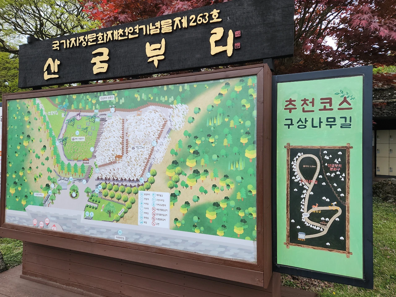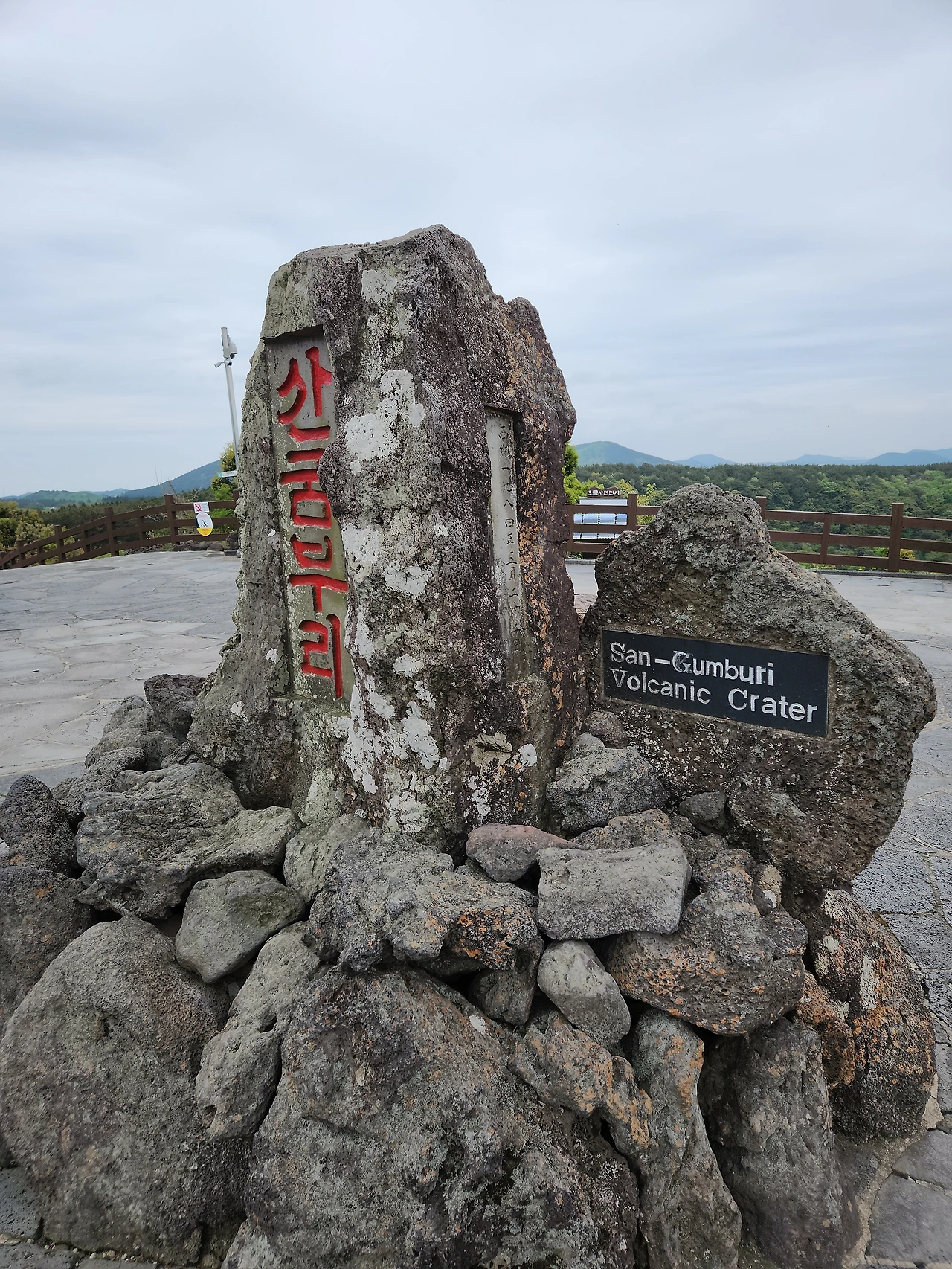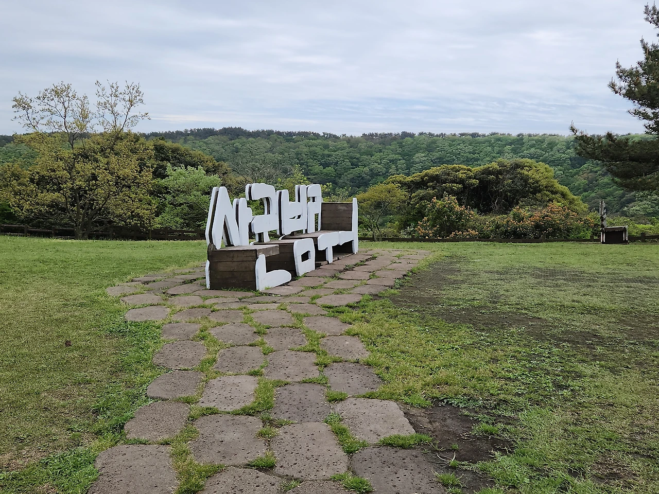 산책길을 따라 내려가니 산굼부리라는 큰 글씨를 쓴 하얀색의 커다란 안내판이 보여서 또 사진을 찍었다. 양팔을 크게 벌려 산굼부리 전체를 내 가슴으로 끌어안았다. 우리는 둘 다 내려가려니 아쉬워서 구상나무숲 오솔길에서 왔다 갔다 시간을 보내다가 출구로 내려왔다.