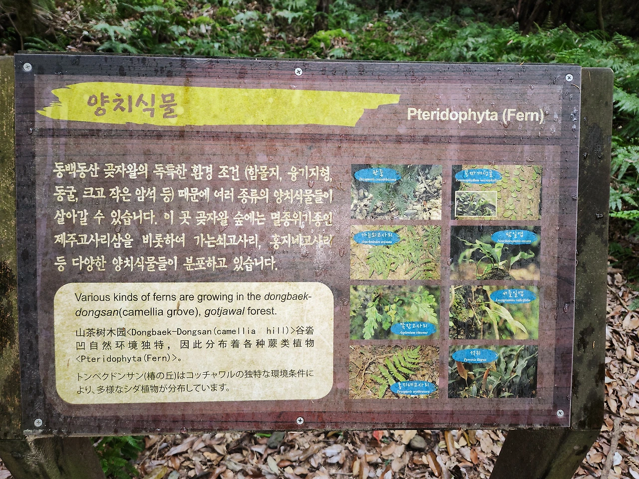 [동백동산] 습지는 선흘곶자왈에 속해있다. 이곳은 지하수 함양이 높고 식물의 다양성으로 2010년 습지보호지역으로 선정되었다. 2011년에는 람사르습지 지역으로 선정되었다. 선흘곶자왈 지역에 동백나무가 많아 붙여진 이름이며 곶자왈은 숲을 의미하는 제주도 방언인데 나무와 덩굴이 엉켜 어수선한 곳을 가리킨다고 (제주어사전)은 정의하고 있다. 주차장은 무료이며 안내센터가 있다. 입구부터 다양한 수목이 우거져 숲길을 이루고 있었다. 빗방울이 떨어지고 있으나 우리 몸에 직접 안 떨어질 만큼 나무들이 터널을 이루며 하늘을 가려주고 있었다. 길바닥에는 묵은 잎들이 떨어져 쌓여 울퉁불퉁한 돌들을 덮어주고 있었다. 습지인 [먼물깍]을 기점으로 남은 거리를 숫자로 표시해 주었고 탐방로에 대한 안내판이 곳곳에 서 있다. 오고 가는 탐방객도 많고 유치원 유아들이 체험학습도 나와있었다. 제주콩난이 줄기 전체를 감아서 함께 자라고 있는 상록수도 보여서 공생의 모습도 보았다. 제주콩난은 구멍 숭숭 뚫린 바위에도 자라고 있었고 길에 나뒹구는 돌에도 이끼가 푸르게 자라고 있어서 습지임을 말해주고 있었다. 줄기가 구불구불한 기이한 모양을 한 나무들 아래에는 멸종위기라는 제주고사리삼이 키 작게 낮은 자리를 차지하여 멀고도 먼 원시림 그대로인 것 같았다. 오래되어 썩어 쓰러진 나무에서 나는 습한 냄새와 파릇한 봄을 맞아 올라온 샛노란 새순에서 나오는 나뭇잎향이 숲 전체에 퍼지고 있었다. 다양한 버섯과 양치식물이 자라고 있는 이곳 [동백동산]은학생들 체험학습 장소로 최적이며 아울러 적당한 거리의 숲길은 산책하기에 아주 좋은 코스로 추천하고 싶었다. 먼물깍에 도착하니 작은 연못이 있고 다양한 수생식물과 소금쟁이를 비롯한 생물들이 꿈틀거리고 있었다. 연못 속이 궁금했다. 이 깊은 숲 속에 이 연못은 도대체 언제 만들어져 어떤 생명체가 저기로 들어왔을까? 1시간 정도 탐방로를 빙 돌아오니 유럽풍으로 꾸민, 말과 마구간까지 갖춘 카페가 있어 들렀더니 정원에는 그동안 내가 만나지 못했던 희귀한 꽃과 나무들로 가꾸어져 있었다. 차를 마시고 나와 조금 더 숲길을 걸으니 출구가 보였다. 눈, 귀, 코가 호강한 동백동산애는 동백나무가 몇 그루정도만 보였으나 주차장에서 나와 차를 타고 나오는 입구부터큰길까지는 동백나무들이 하늘 높은 줄 모르고 자라서 온통 양쪽 길을 차지하고 있었다.