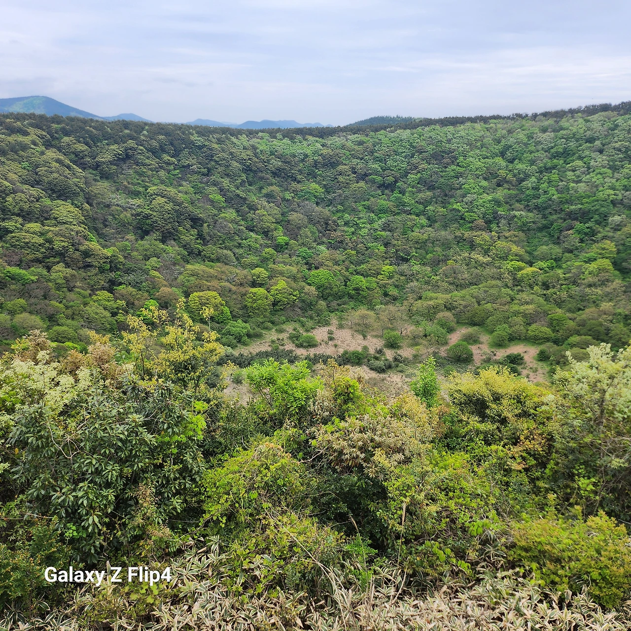 [산굼부리]로 핸들을 돌렸다. 매표를 하고 들어서는 입구부터 감탄사가 나왔다. 벌써 봄인데도 어마어마한 넓이의 누런 억새밭이 반겨주었다. 여러 갈래의 길이 있었다. 우리는 억새길을 택하여 가파르지 않은 정상에 오르니 영화를 찍었다는 한 장소가 나왔다. 외롭게 서 있는 한그루의 나무와 옆에는 널찍한 돌이 있었다. 거기서 우리도 영화 흉내를 낸 사진을 찍고 전망대에 올라 아래를 바라보니 분화구에는 온통 숲으로 우거져 세월의 흔적을 보여주었다. 나무가 거의 없던 [다랑쇠오름]의 분화구와는 비교가 되었다. 각양각색의 나무들의 모습이 위에서 바라보니 부글부글 끓어 부풀어 오르는 거대한 녹색의 화산돌덩어리들처럼 보였다.날개가 있다면 훨훨 날아 분화구 아래로 내려가 그 자리를 지키고 있는 나무들에게 인사를 하고 싶었다. 경이롭다는 단어 말고는 무엇으로 표현해야 할지 모르겠다.