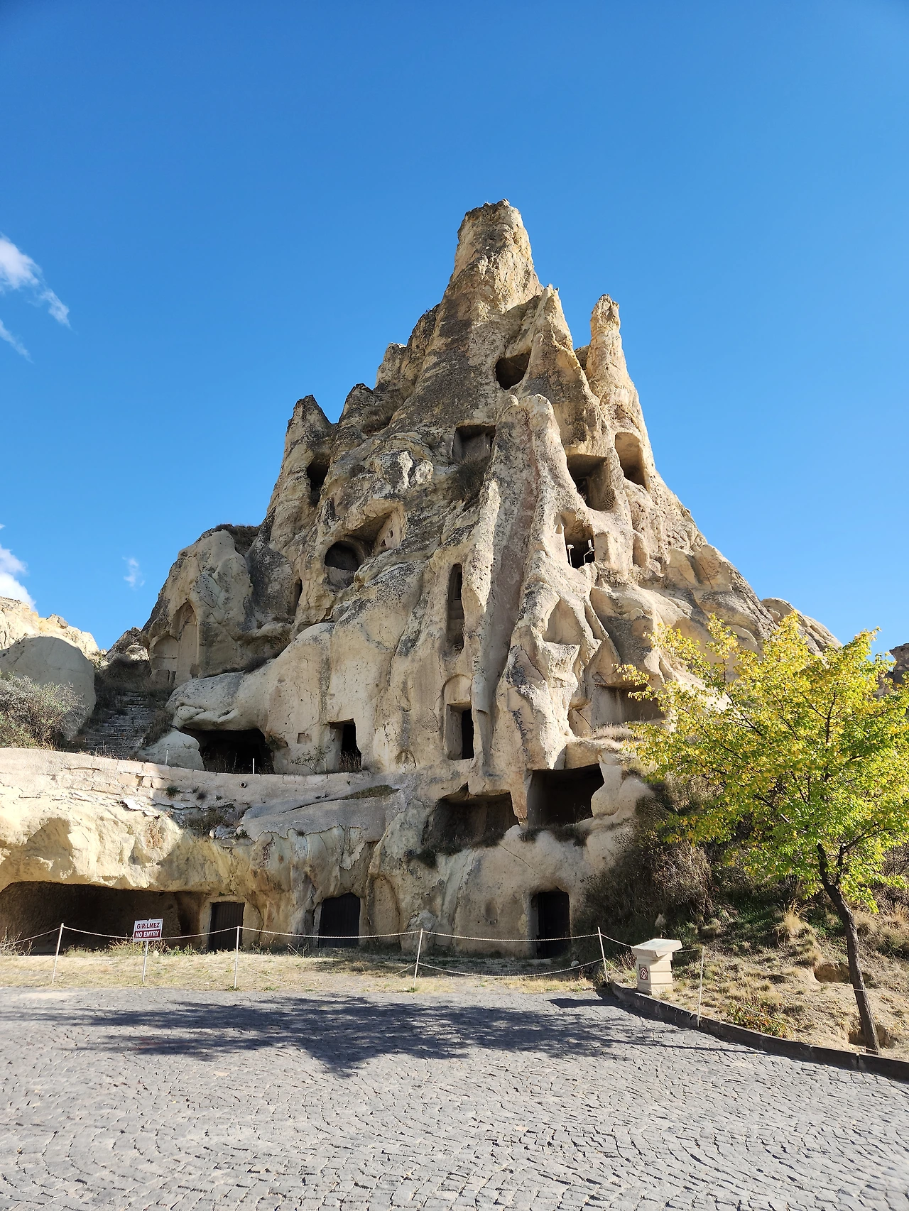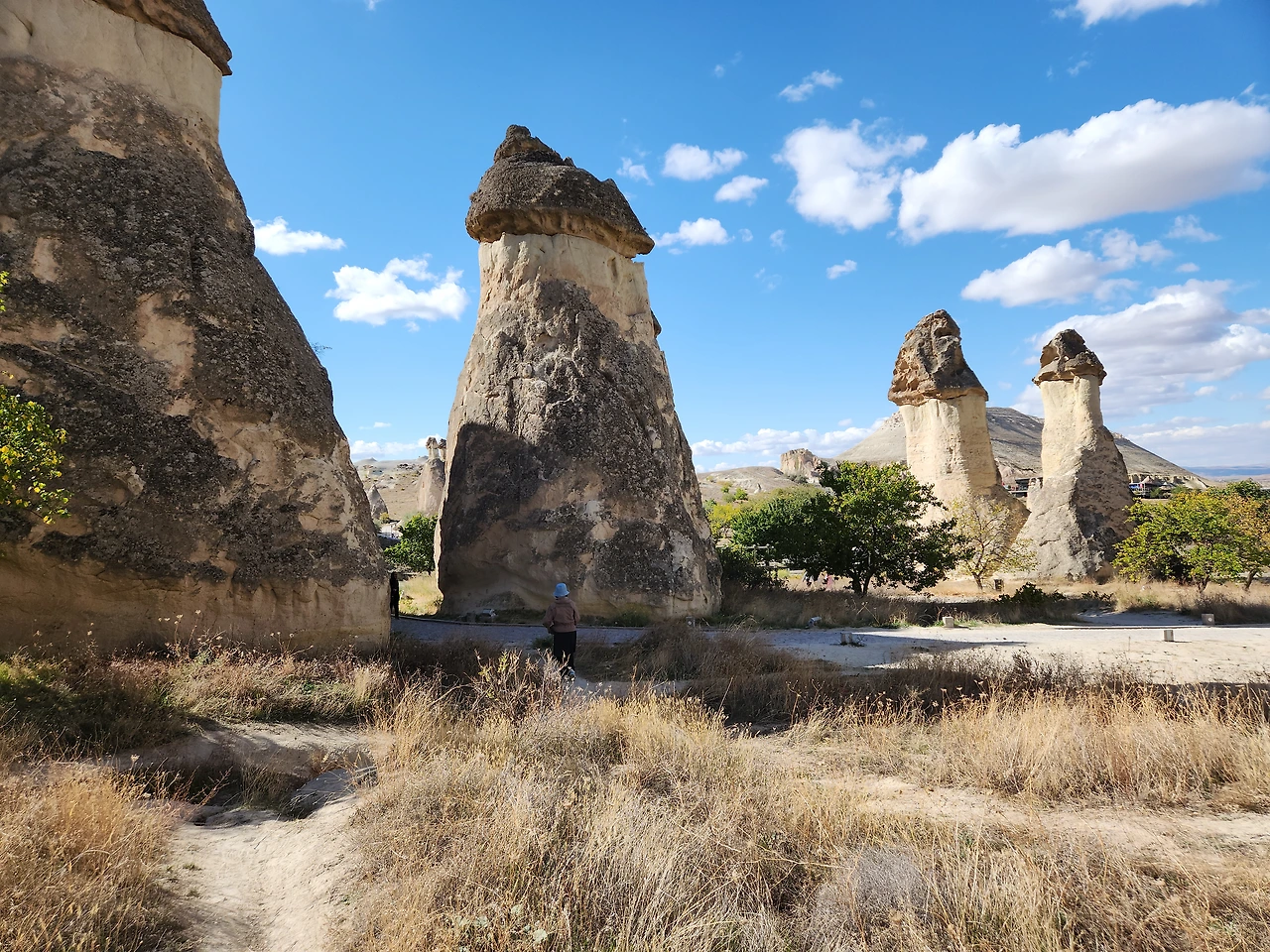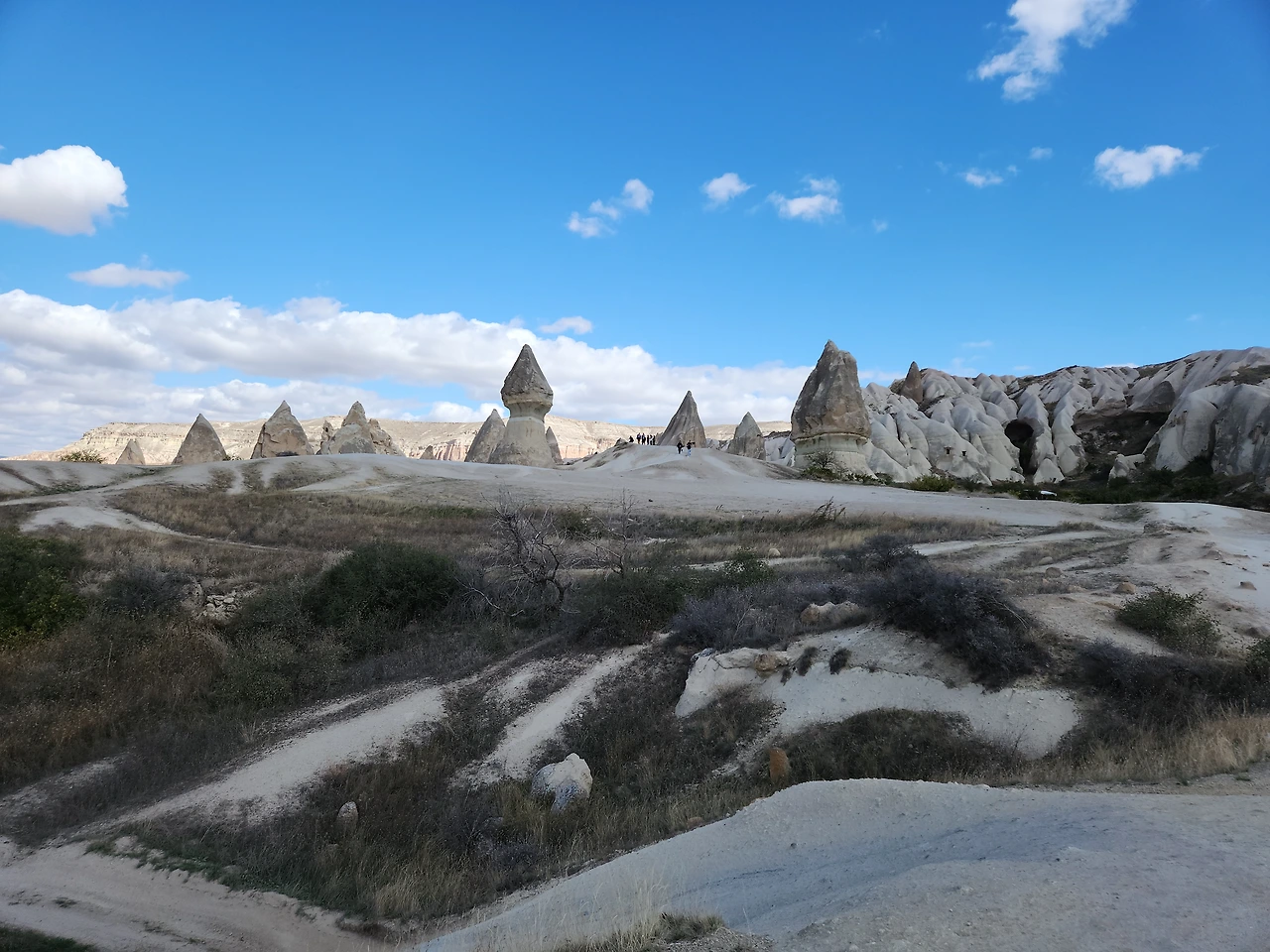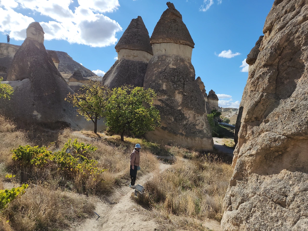 1시간 40분 소요하여 카이세리로 도착한 우리는 다시 버스로 1시간 걸려서 카파도키아에 도착하였다. 버스로 괴레메 국립역사공원으로 향하는 도중에 우리들의 눈앞에 펼쳐진 논밭에는 거의 비어있었으나 가끔 보이는 밭에는 멀리서 보니 작은 호박 같은 것들이 뒹굴고 있었는데 나중에 알고 보니 멜론이라고 하였다. 식사 후 멜론이 계속 나와서 많이 먹었다. 지금 터키는 농사 준비기간이라고 하였다. 땅덩어리가 워낙 커서 우리나라와 비교가 안되었지만 이스탄불은 우리나라의 가을날씨와 비슷하여서 준비해 간 가을 옷이 적당하였다. 그러나 카파도키아에 내리니 약간 더울 정도로 따뜻하여 26도쯤 되어서 가벼운 반팔을 하고 다녔다. 어쩌면 하늘이 그렇게도 청명하면서 파아란지 그야말로 한 폭의 수채화 같은 모습이었고 버스를 타고 가면서 본 자연의 색깔은 낙엽이 지고 있는 듯한 모습과 더불어 화산폭발의 결과물인 기암괴석의 회색과 더불어 온통 회갈색이었다. 그리고 공장이라고 추측할 수 있는 굴뚝들이 하나도 보이지 않은 것이 이상하였다. 튀르키예는 지금이 농사 준비기간이라고 하더니 논밭들이 깔끔하게 정비되어 잡초하나 보이지 않는 깔끔하게 정비된 모습들이었다. 신기하고 이상한 모습들의 갖가지 바위들이 모여있는 산을 바라보면서 자연의 경이로움에 입이 다물어지지 않았다.