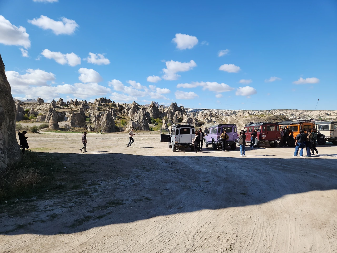 우리는 지프차에서 내려 사진을 찍고는 와인으로 축배를 들었고 그 빈 잔에 기사들에게 고맙다는 팁을 주기도 하였다. 다시 장미계곡을 지나 내려서 여유 있는 자유 시간을 가지며 사진을 찍고 탐험 활동을 하였다. 함께한 가이드가 해박한 지식으로 전문 용어를 사용하며 지형의 시대별로 발생한 특징과 튀르키예의 지형 역사를 자세하게 설명하였으나 굳어버린 내 두뇌 속으로는 아무것도 들어오지도 않고 오로지 휘황찬란한 모습으로 내 눈 속으로 들어온 것만 인식되어 자리 잡고 있을 뿐이었다. 아, 이런 세상도 있구나 싶었다. 죽기 전에 가볼 만한 곳을 추천하라면 1순위로 하고 싶었다.