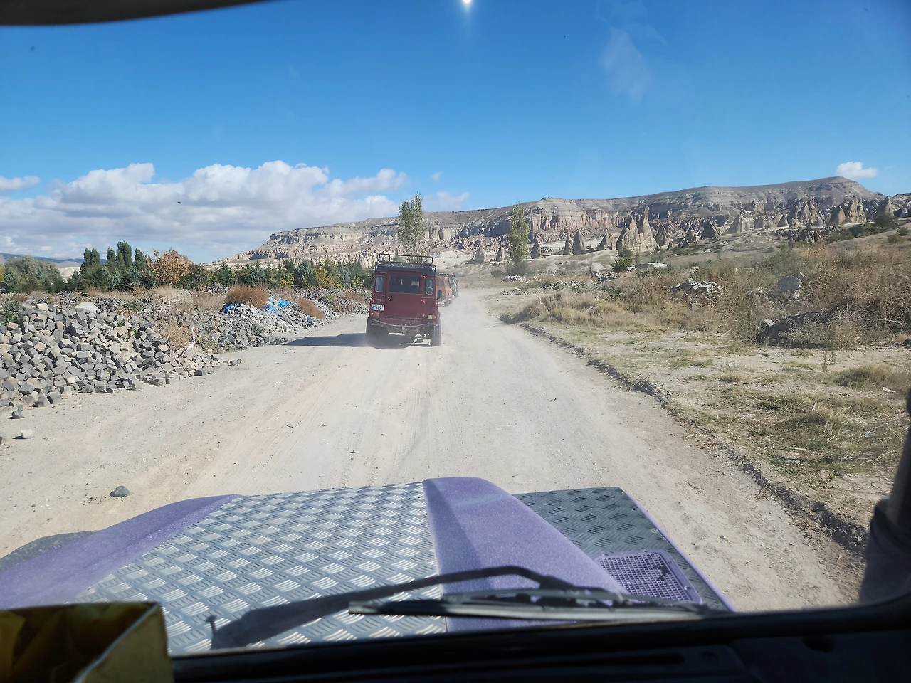 세계유네스코 문화유산으로 지정된 카파도키아의 괴레메 마을의 야외박물관에 도착한 버스는 우리를 어느 주차장으로 내려놓았고 우리는 4인 1조로 지프차를 타고 1시간 40여분을 구석구석 돌아다니며 특이한 지형을 살펴보며 투어를 했다. 가는 도중에 발견한 버섯바위 파시바, 멀리 보이던 카파도키아에서 가장 높은 산이라고 하던 우츠히사르의 절벽 바위마다 큰 구멍들이 나있었고 그곳은 기암괴석 요정의 굴뚝이 즐비하였다. 그리스도 박해를 피해 온 그리스도인들이 만든 석굴의 모습들이 군데군데 보였다. 우리를 태운 현지 지프차 운전기사는 기발한 운전 솜씨로 우리를 아주 놀라게 하며 차바퀴를 공중에 띄우며 가슴을 철렁하게도 하다가 얌전하게 운전하면서 속도를 늦추어 주변 경관을 살펴보는 시간을 주기도 하였다. 눈으로 보는 그 장소는 그야말로 자연의 박물관 그 자체였다. 멀리 보이던 로즈밸리라고 부르는 계곡은 산 허리까지 붉은 장미 색깔로 보여서 그렇게 불린다고 하였다. 카파도키아에서 가장 높은 산이라고 하는 우츠히사르를 멀리에서 바라보았다. 머리 모양이 버섯모양인 바위를 비롯하여 기괴한 모습들의 돌들이 온통 천지에 깔려 있는 장소였다.