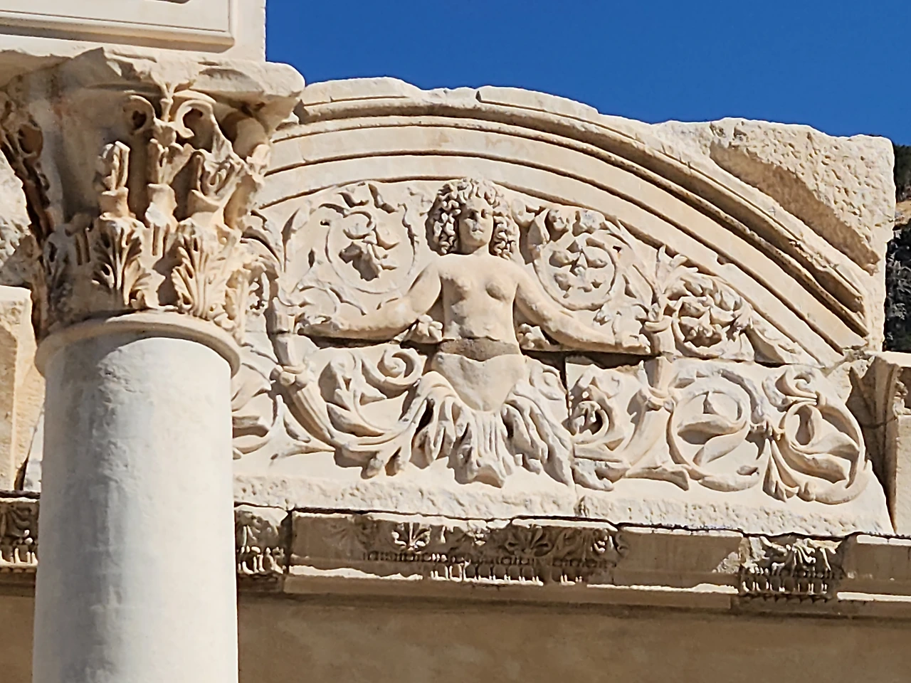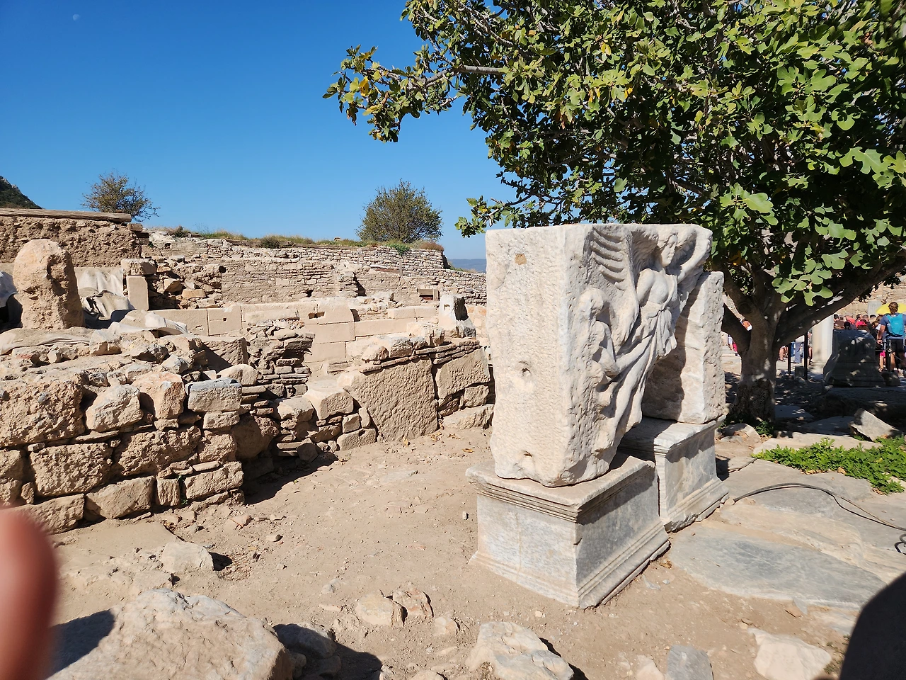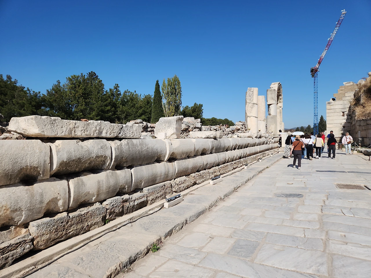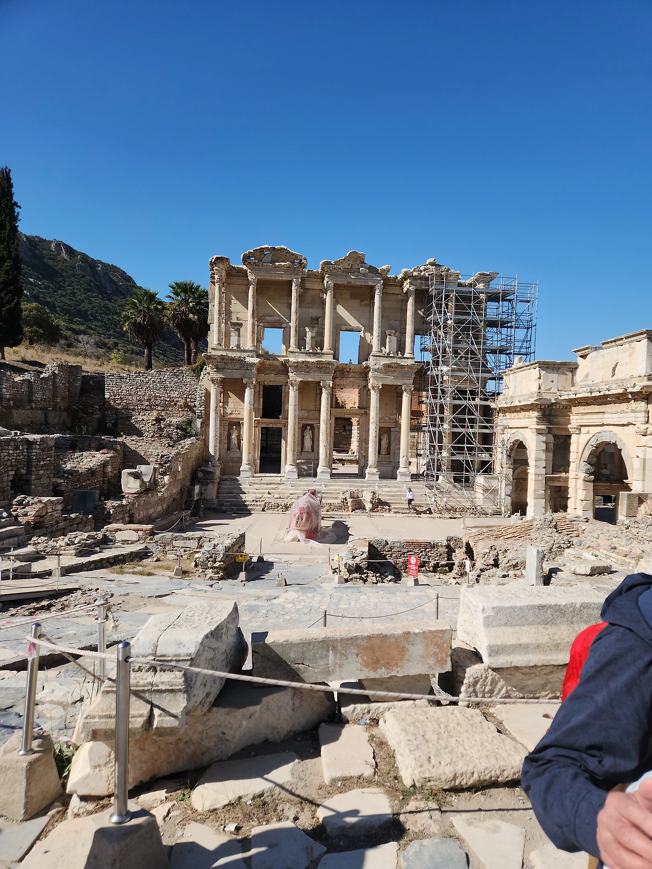 나는 가기 전에 관심이 많았던 곳이 셀수스 도서관이다. 셀수스 도서관은 에페소 유적 가운데서 가장 훌륭한 것 중의 하나로 그곳은 세 개의 문이 있는데 각각 상단은 지혜, 운명, 지식을 상징하는 정결한 여성상들로 장식되어 있었다. 그날은 마침 줄을 쳐놓고 접근 금지가 되어있었다. 공사 중인 것 같았다. 기대는 안 했지만 내부 구조가 궁금했었는데 멀리서 외형만 바라볼 뿐이었다.