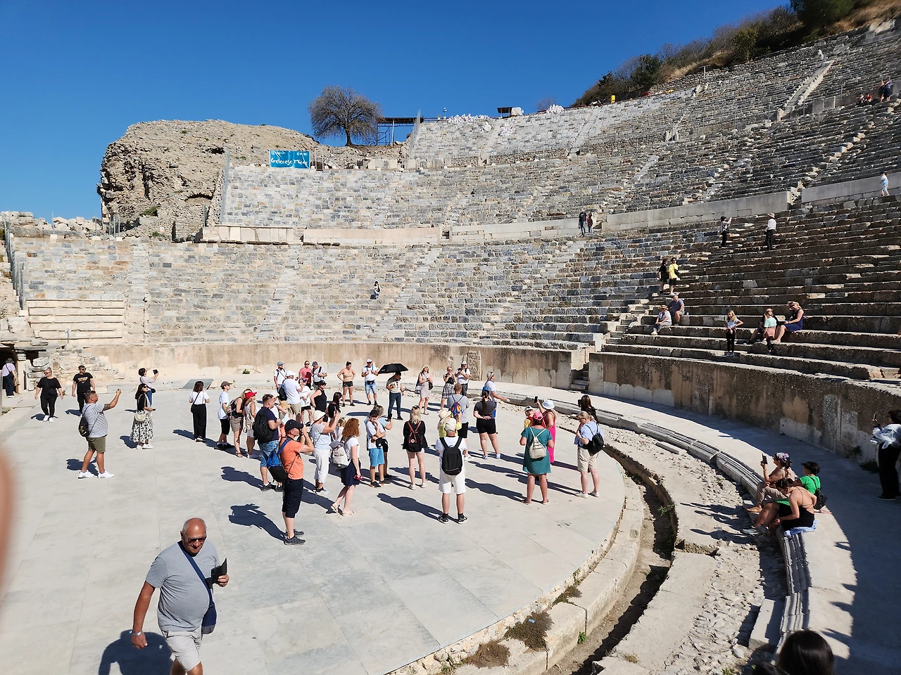 대극장은 헬레니즘 시대에 만들어진 원형대극장으로 연극, 문화예술, 검투사들의 싸움이 열린 곳이라고 한다. 2만 5천 명 이상의 관객을 수용할 수 있는 규모로 세계에서 가장 큰 원형 극장 중 하나로 3단 구조의 각단은 22개의 계단으로 이루어져있다고 한다. 무대에서 관중석 끝까지 목소리가 전달되도록 건축설계가 되어 있어 실제 관광객 음성이 맨 위층까지 들린다고 하였는데 마침 어느 단체객의 인솔자가 큰 소리로 노래를 부르고 다른 일행은 거기에 맞추어 박수를 치는데 위층까지 또렷하게 들렸다. 거의 원형 그대로 보존되어 있었다.