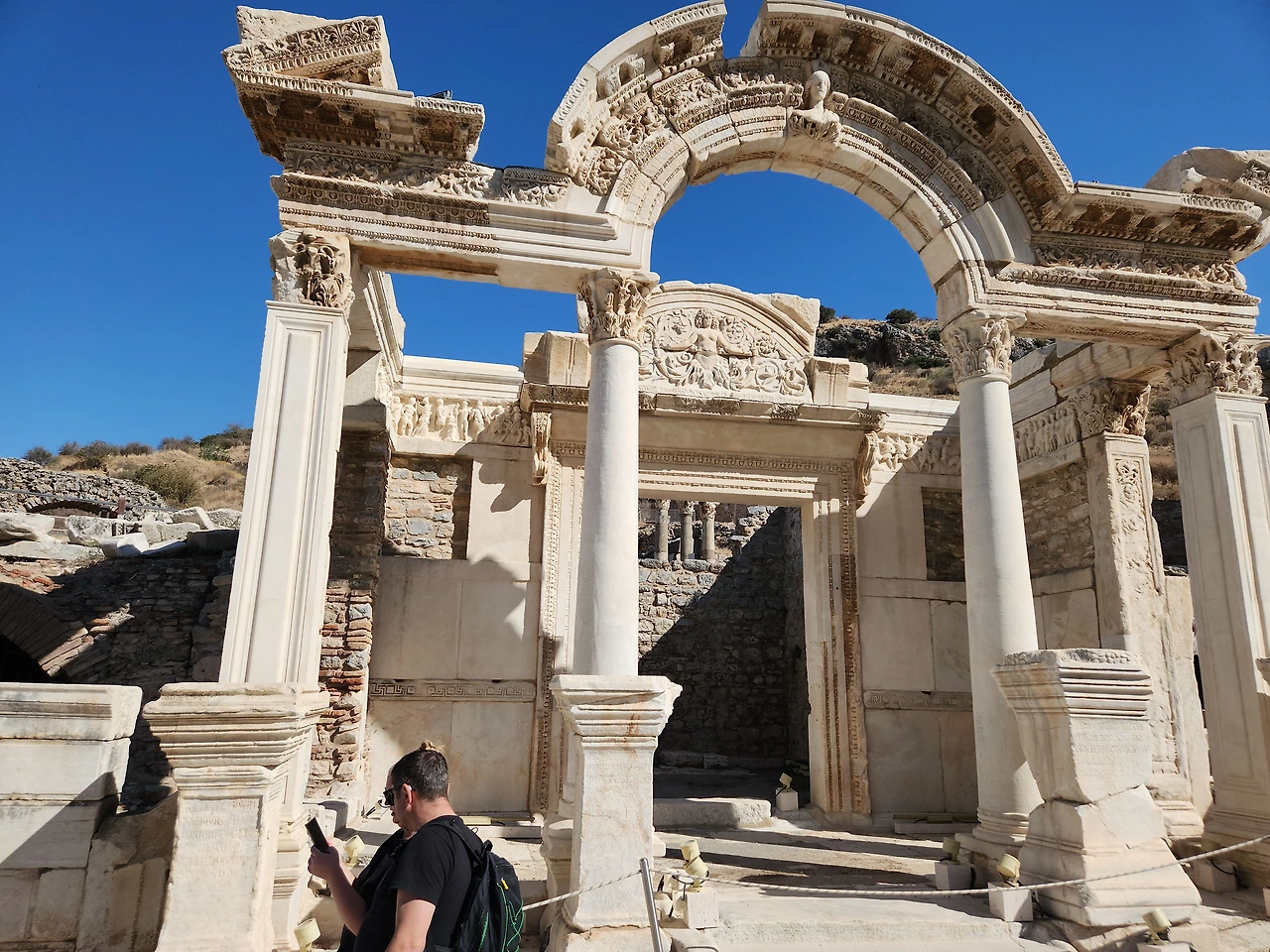 하드리아누스 신전은 에페소스 시민들에 의해 지어져 하드리아누스 황제에게 바쳐졌다고 한다. 최근에 복구된 이 신전은 신전 입구에서 안으로 들어가니 돌담 위에는 신과 여신들의 부조가 가득하였다. 신전 전면 4개 기둥 중 2개의 기둥을 잇는 아치는 에페소에서 가장 아름답다는 평가를 받는다고 하였다.