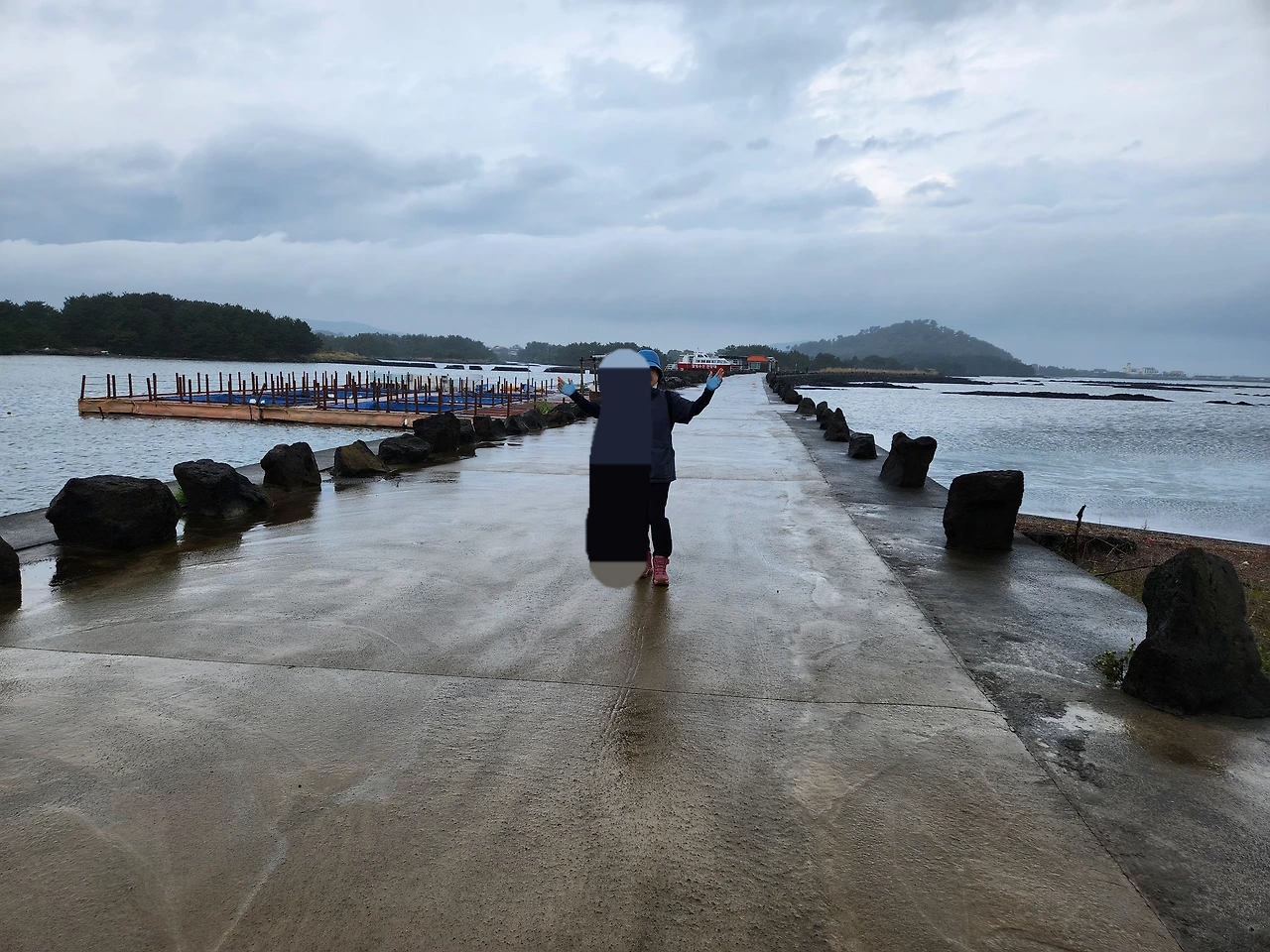8시 20분경, 숙소에 있으면 무료하니까 일단 올레길 2코스 출발점 광치기해변 주차장으로 갔다. 거기서 걷기 시작하여 종착점 온평리에서 다시 택시를 타고 우리 차가 있는 곳으로 돌아올 계획이었다. 차를 세우고 나니 부슬비가 내렸으나 우산을 쓰고 출발점을 가서 우선 시작 도장을 찍었다. 어제 본 일출봉이 또 우리를 보고 있다. 하늘을 보니 반은 검은 구름으로 덮여있고 반은 맑은 하늘이 보이기 시작하여 걷기로 하였다. 광치기해변 주차장 앞에는 넓게 조성된 유채밭이 있었는데 노란 물감을 뿌려놓은 듯 샛노랗다. 오조리 둑방길을 걷다 보니 어마하게 만들어놓은 양식장이 있었으나 지금은 버려져있었다. 투자비용이 아깝다. 식산봉이 나타났다. 생각보다 완만해서 걷기 쉬웠다. 다시 바다 위 테크길을 지나 수산리 동네를 지났다. 앞서거니 뒤서거니 하는 사람들은 다들 우리보다 걸음이 빠르다.
