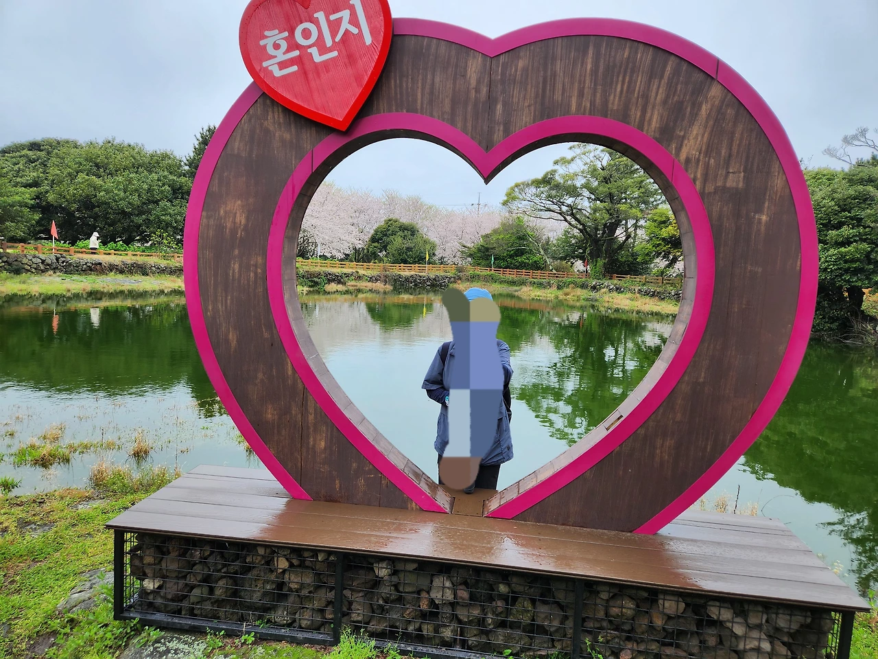 숙소 근처인 혼인지에 들르니 또 단체로 온 사람들이 많이 몰려있다. 삼성혈에서 솟은 탐라의 시조 고, 양, 부의 혼인 이야기가 전해 내려오는 연못이었다. 제주특별자치도 기념물 16호 지정되어 있다. 우리도 옛날 혼인 복장으로 나무 인형뒤에서 얼굴만 내민 채 사진을 찍었다. 연못 주변은 벚꽃이 만발하였다. 다시 동네길로 접어들어 걷다 보니 바닷길이 나왔다. 고려말에는 삼별초가 들어오는 것을 막고 조선시대에는 왜구를 막기 위해 돌담으로 이루어진 환해장성이 나타났다. "탐라의 만리장성"이라도 한다고 하였다. 바닷가를 따라 다시 걸으니 2코스 종점인 온평리 스탬프가 멀리서 보였다. 걸음보다 마음이 앞서갔지만 완주한 늙은 우리 부부에게 칭찬을 해주고 싶었다. 남편이 내 마음과 통하였는지 하이파이브를 하자고 하였다.
