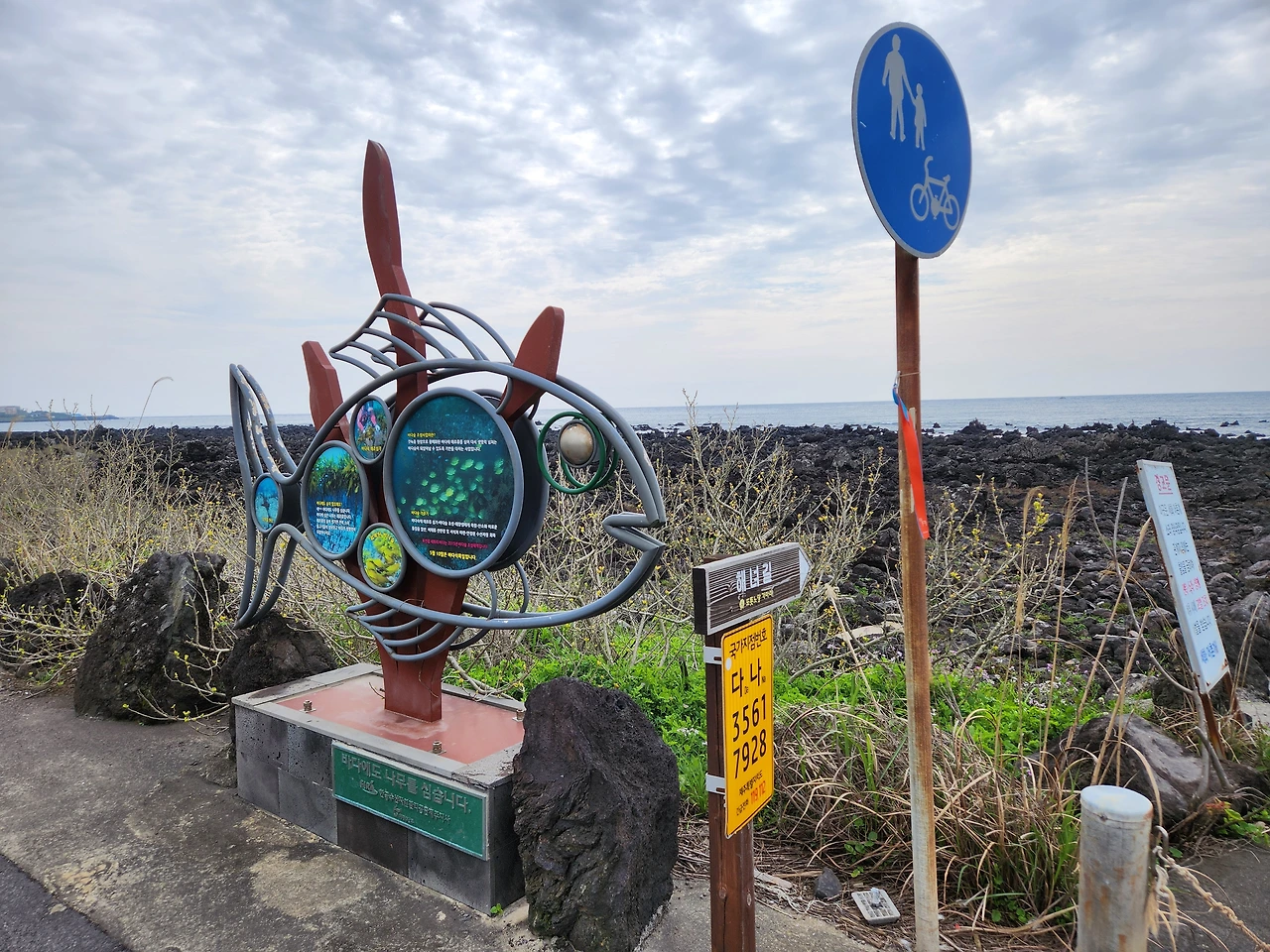 어제 마무리한 3구간 종착지이자 4구간 시작점 표선해수욕장 인근에 있는 제주민속촌 주차장에 주차를 했다. 출발하기 전에 남편이 "해내겠나?" 하고 물었다. "걱정 마슈"하고 대답은 했지만 거리가 너무 멀고 해안선을 따라 주욱 걷기 때문에 단조롭고 심심할 것 같았다. 하지만 날씨는 구름이 약간 덮여있어서 걷기에는 안성맞춤이었다. 남편은 하늘이 자기를 늘 돕는다나? 옆에서 나는 콧방귀를 피식했다. 9시 조금 넘은 출발 시간인데 가족, 부부, 연인, 서너 명씩 조직된 그룹, 자전거 팀 등 다양하게 걷거나 달리고 있었다.