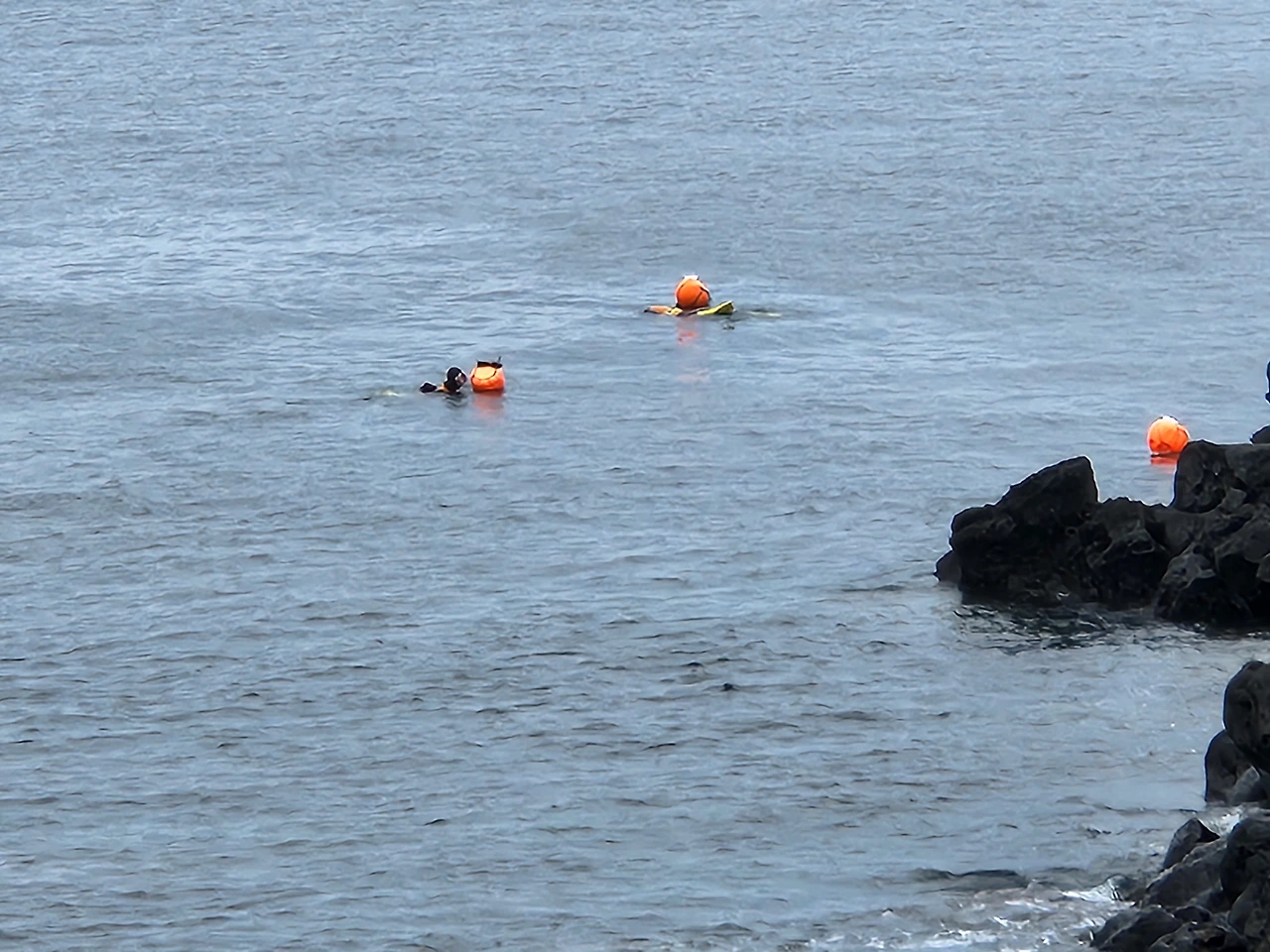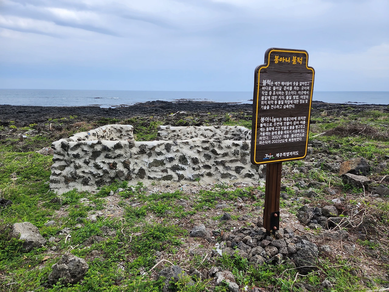 다시 해양수산연구원을 지나고 갯늪을 지나니 황근자생지 세화 2리가 나타났다. 세화 2리의 옛 이름 가마리의 해녀 올레는 '세계최초의 전문직 여성'으로 불리는 해녀들이 바닷가로 다니던 길이라고 하였다. 황근은 우리나라에 자생하는 무궁화 속 식물로 8월경에 노란 꽃이 핀다고 한다. 구불구불한 나무의 줄기모습이 특이하였다. 멸종위기인 이식물을 국립생물자원관에서 대량 증식한 황근을 기증받이 복원하였다고 한다. 토산 2리 마을회관 중간 스탬프를 찍었다. 오늘은 해녀들이 물질하는 모습을 보았다. 사진을 멀리서 당겨 찍기도 하였다. 덕돌포구쯤에 산긋불턱이 나왔다. 해녀들이 옷을 갈아입고 바다에 들어갈 준비를 하는 곳이며 휴식하는 장소라고 하였다.